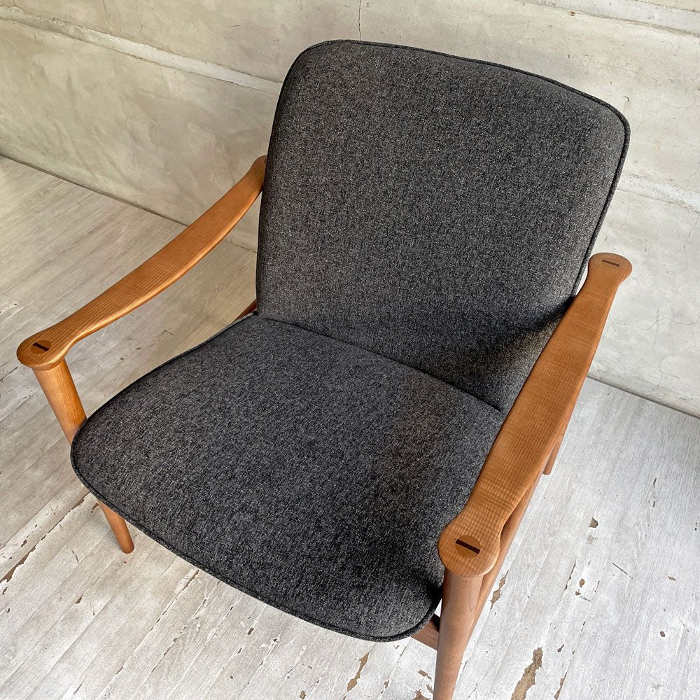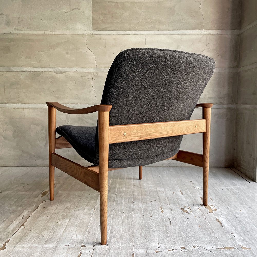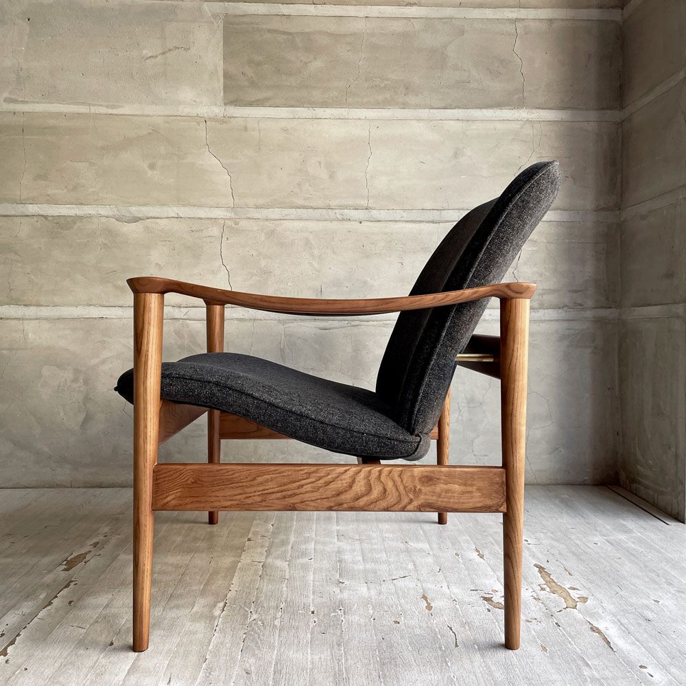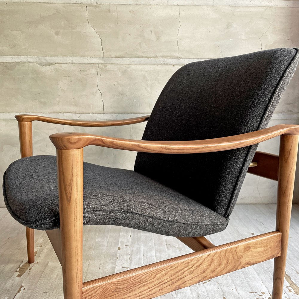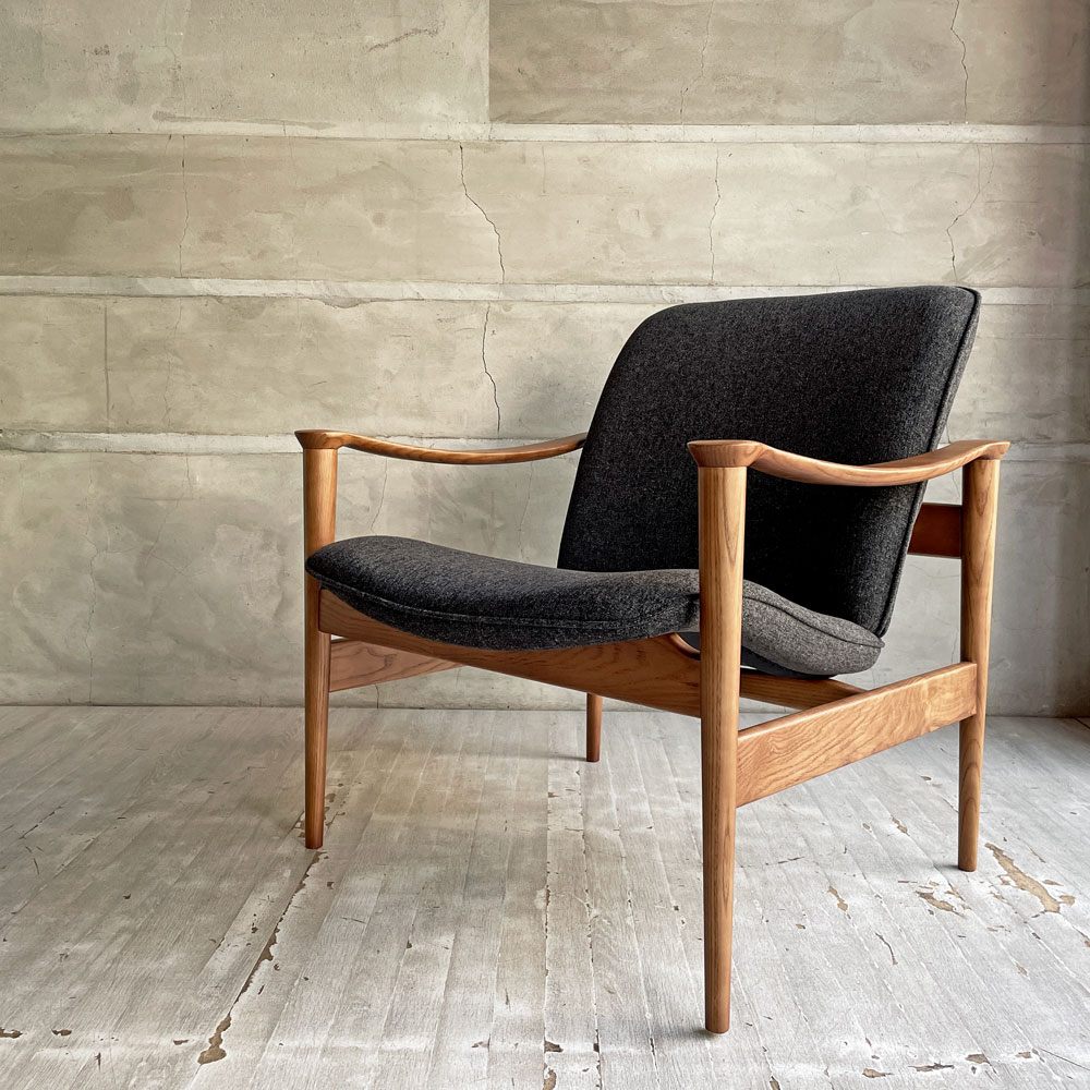 熟練の職人により削り出された木製フレームの曲線的な美しさが光るラウンジチェア。