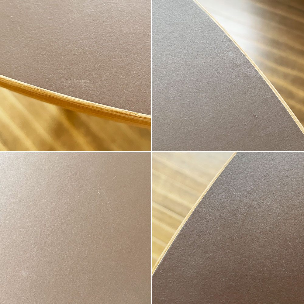 天板には薄っすらとしたシミ汚れや擦れ、傷、打痕、わずかな表面の浮き等が見受けられるとともに、側面には色落ちや取り切れない黒ずみ汚れがございます。また、脚部には擦れや打ち傷、若干の凹みや削れ、、表面塗装のムラやくすみ汚れがございますが、いずれも著しく目立ったダメージではございません。その他、脚底のアジャスターのねじ部分に錆が生じ、やや固くなっていますが、ご使用に問題となるがたつきやぐらつきはございません。今後も安心して実用いただけるコンディションを保っております。