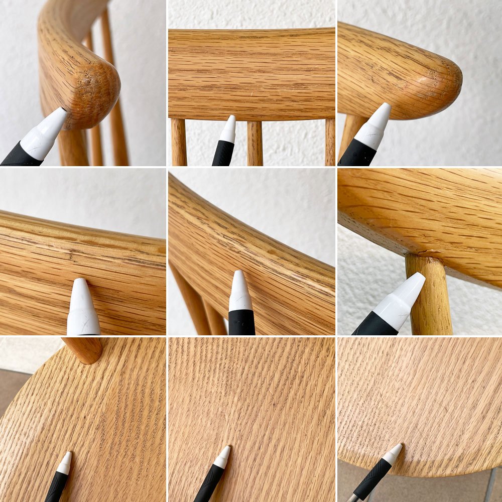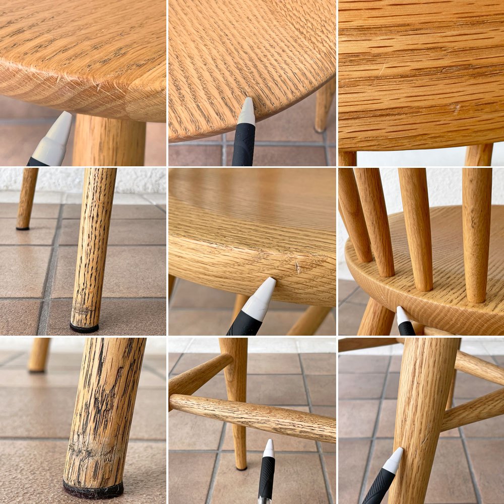 使用に伴う擦れ傷の他、打痕や線傷、脚部全体を中心に木目の黒ずみや色褪せ、木部表面の小さなヒビや接着、レタッチ痕などやや使用感はございますが、いずれも大きく風合いを損なうものではございません。グラつき等ご使用に問題となるダメージは無く、今後とも雰囲気を楽しみながらお使い頂けるUSED品として概ね良好なコンディションを保っております。