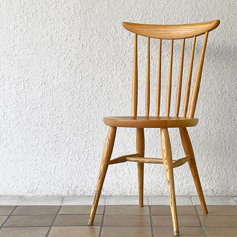 明るいナチュラル色と心地よい木肌。抜け感のある背もたれが目を惹き、上部の笠木の角を丸く削り、丸い板座も相俟って、全体の印象を柔らかく仕上げています。