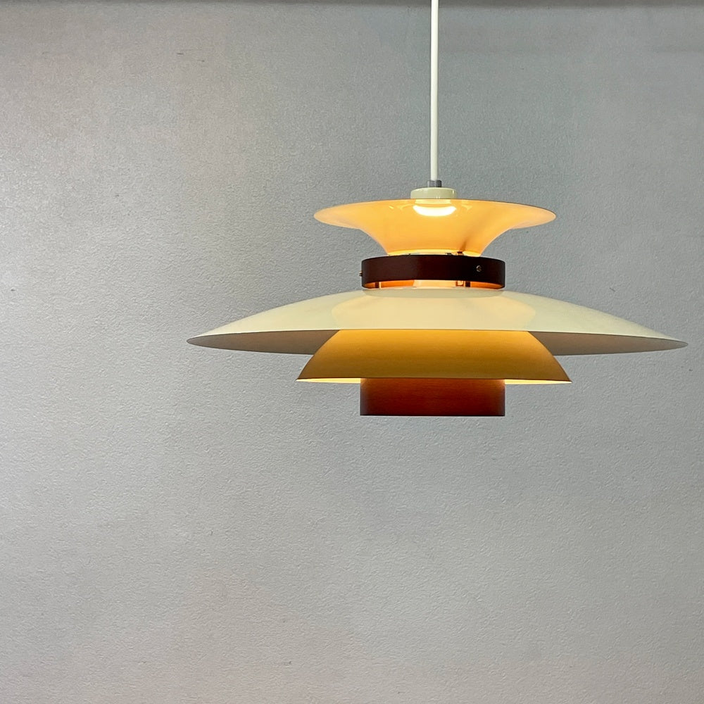 3枚のスチールシェードに木材を組み合わせる事によって温かみのあるデザインに。
