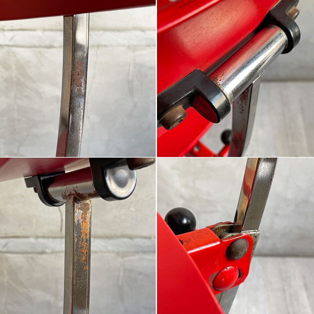 こちらはビンテージ品です。使用や経年に伴い、背もたれ・座面に擦れや線傷等の小傷、キャスターのプラスチック部に一部割れ、金属部に錆が生じております。また、キャスターのひとつに歪みが見られ、それによりややキャスター動き悪くなっておりますが、通常使用には問題の無い程度のものかと思われます。その他、大きく美観を損なうようなダメージなども無く、ビンテージ品ならではの風合いをお楽しみいただけるコンディションを保っております。