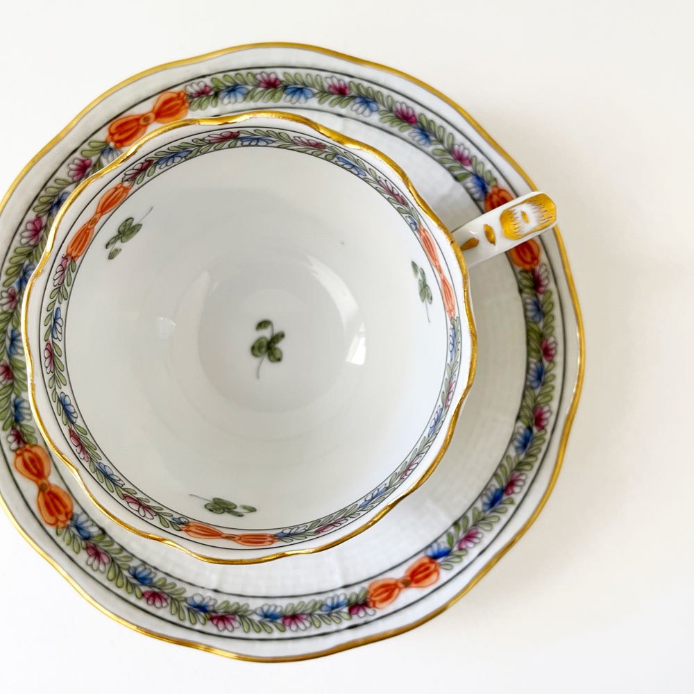 ヘレンドグリーンと呼ばれる清楚な緑色のほかにも、多くのカラーで展開される同シリーズ。こちらはカラフルな色が使われた多彩色のモカカップ&ソーサーです。