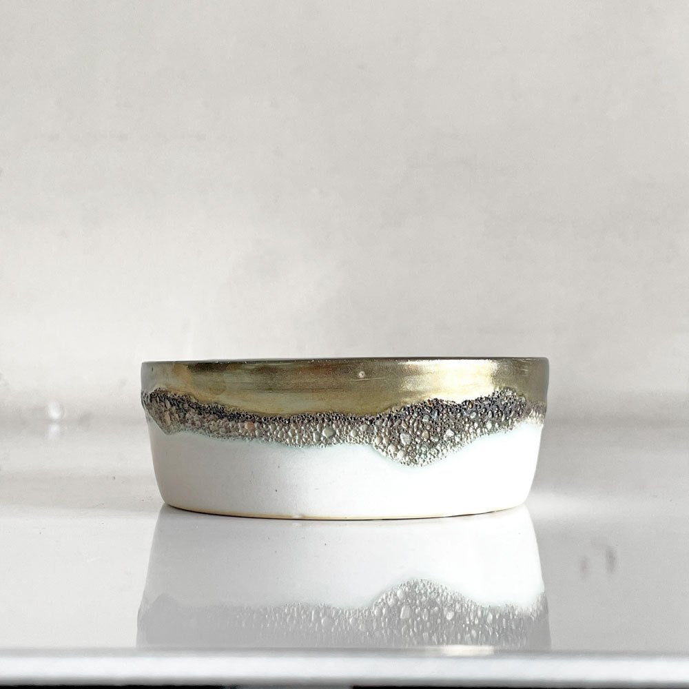 材料の調合の僅かな違いで変化する釉薬を用いて、低温で何度も焼成を繰り返すという手のかかる作業を経て生み出された独創的な風合いは、一つとして同じ表情が生まれることはなく、すべてが一点物。