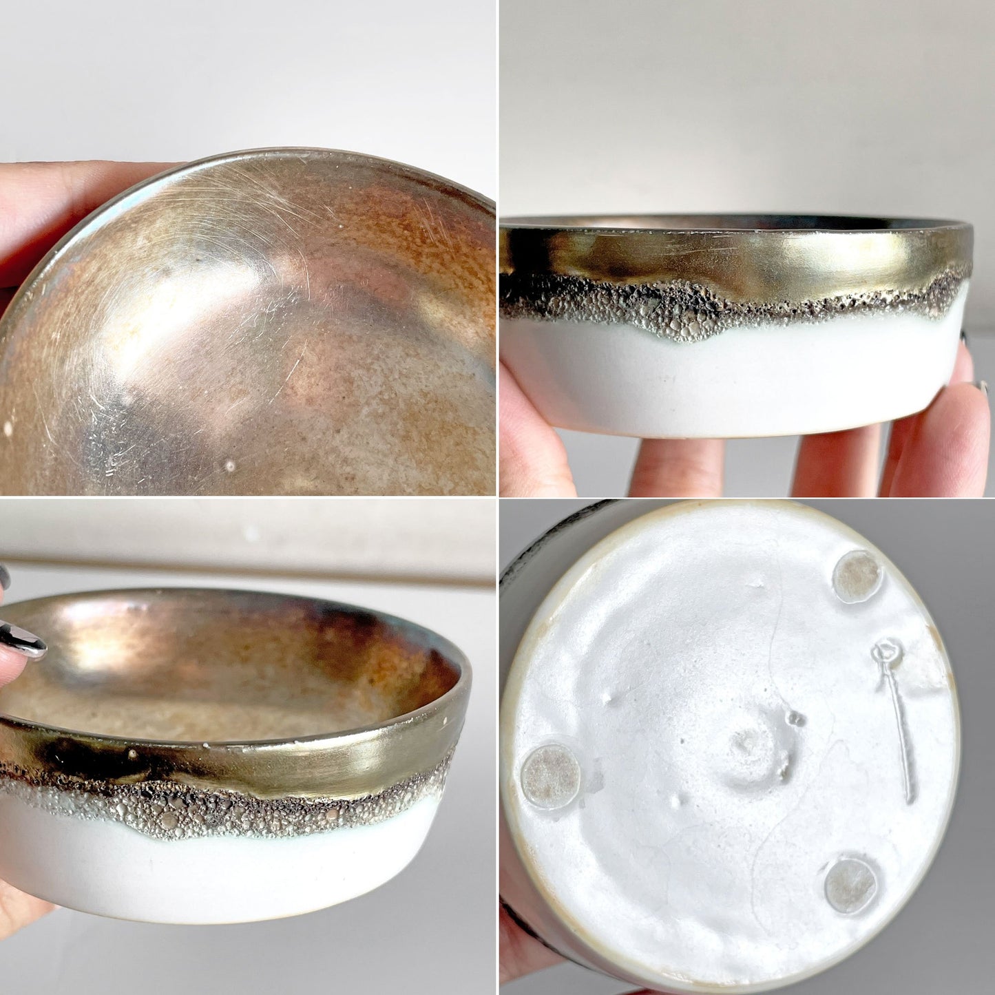 使用に伴い、酸化によるくすみが内部に見られますが素材の特性上やむを得ないものとなりますのでご了承下さいませ。また、製造時のものと思われるホツや釉薬の色むらがございますが風合いとしてお楽しみ頂けます。その他、割れやひび等の使用に問題となるようなダメージの見られない、概ね良好なコンディションを保っております。
