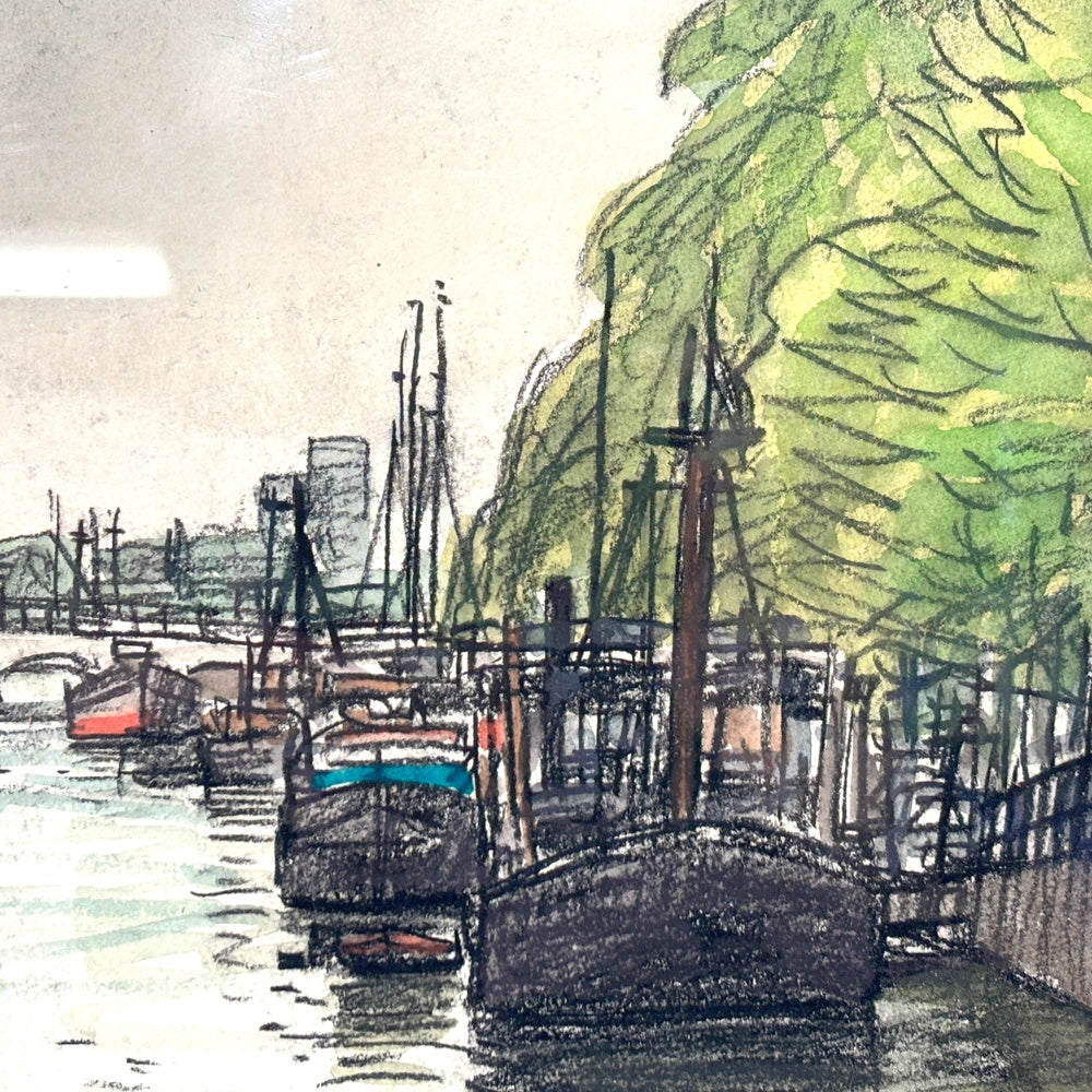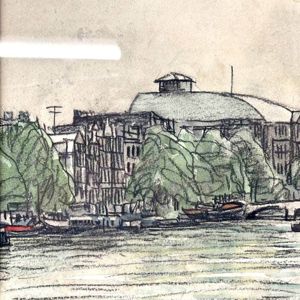 アムステルダムの風景を水彩絵の具による淡い色合いと太い黒色の線描で表現。水の流れや建物の構造、街の空気感等、ハンドドローイングとペインティングにより味わい深く表現されています。