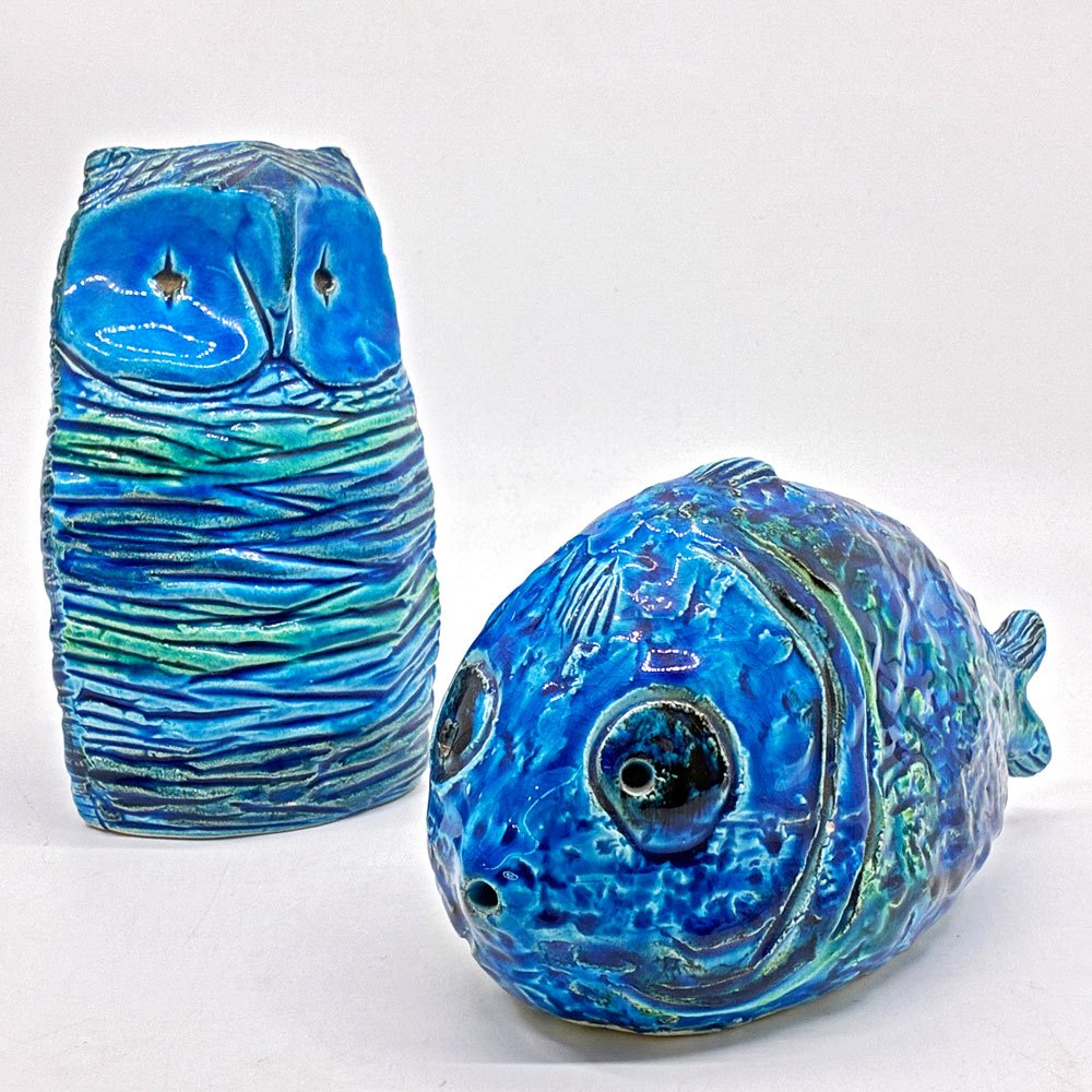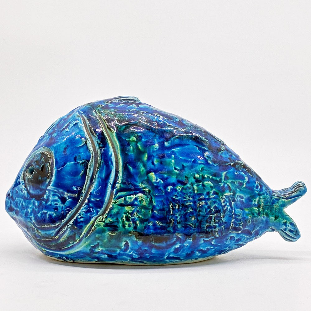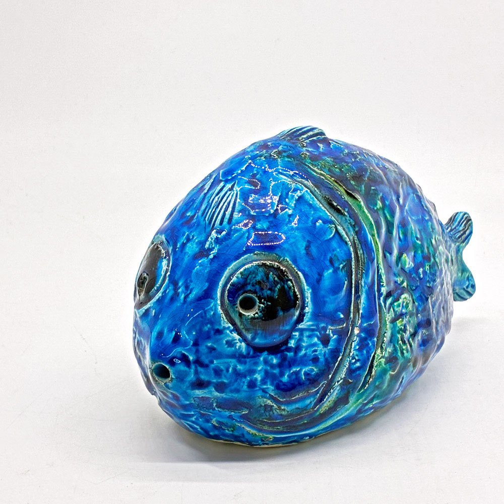 こちらは同社のアートディレクター" アルド・ロンディ / Aldo Londi "により手掛けられ、世界的人気を集めたアニマルモチーフシリーズのひとつ「リミニブルー」の魚になります。地中海を思わせる鮮やかな青と緑の釉薬。ぽってりとした丸いフォルムと表面の凹凸が人目を惹きます。