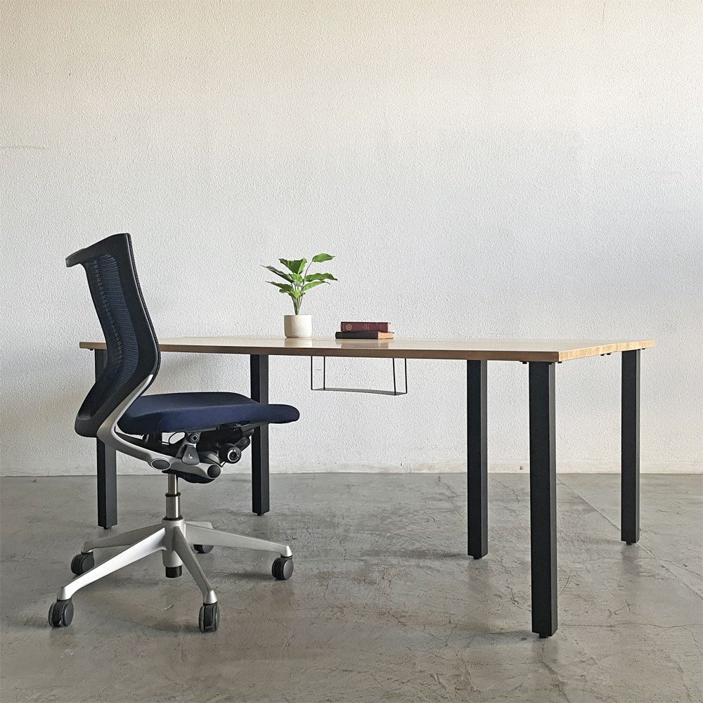 こちらは、すっきりとした角柱鉄脚に優しい雰囲気で人気のナチュラルなラバーウッド材天板を合わせた「ザ・テーブル | THE TABLE Black Steel」。中央に配線トレーを配した大型サイズのデスクです。