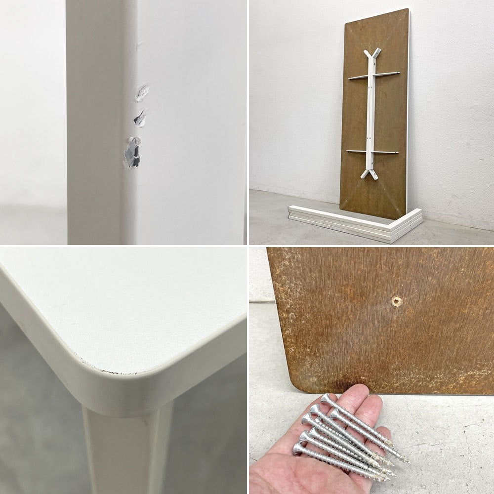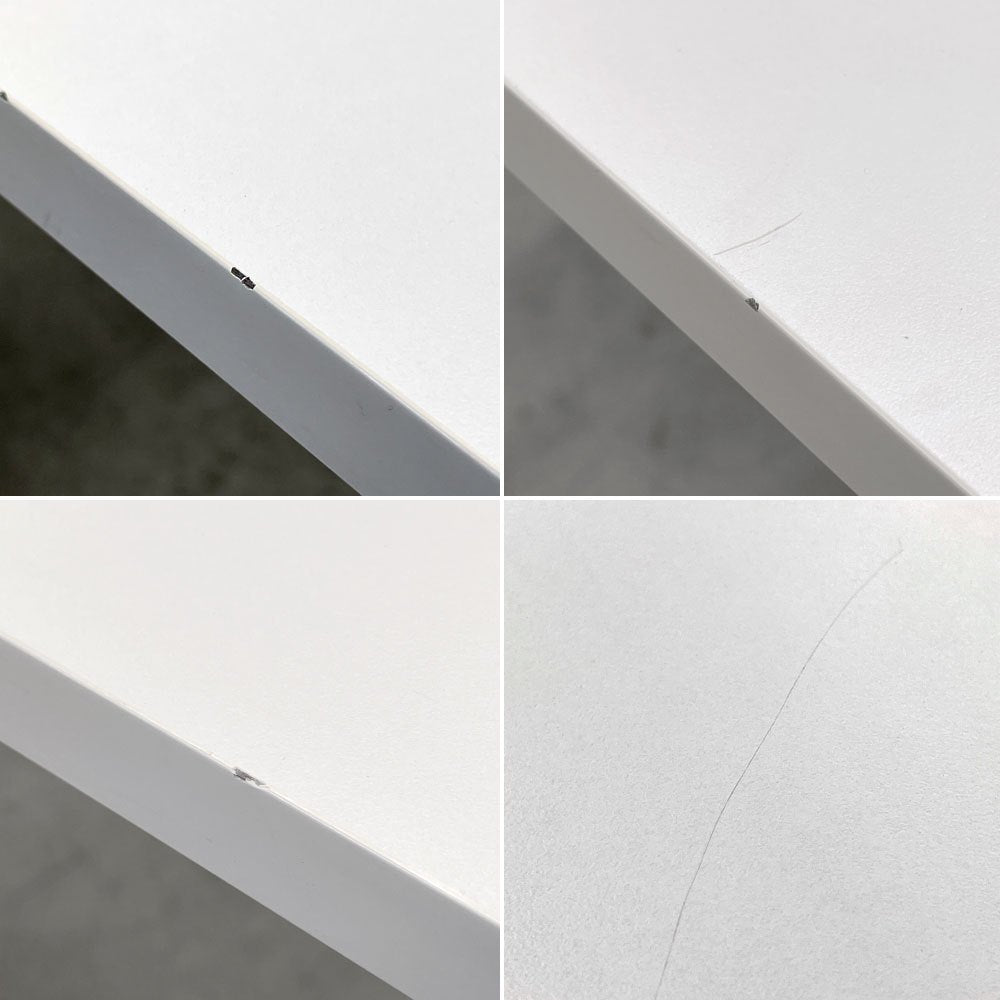天板に線傷や、擦れが複数、縁には打痕によるペイントロスが散見されます。また、脚部にも擦れやペイントロスが見受けられますが、著しく目立つようなものはございません。USED品としては概ね良好なコンディションを保っております。