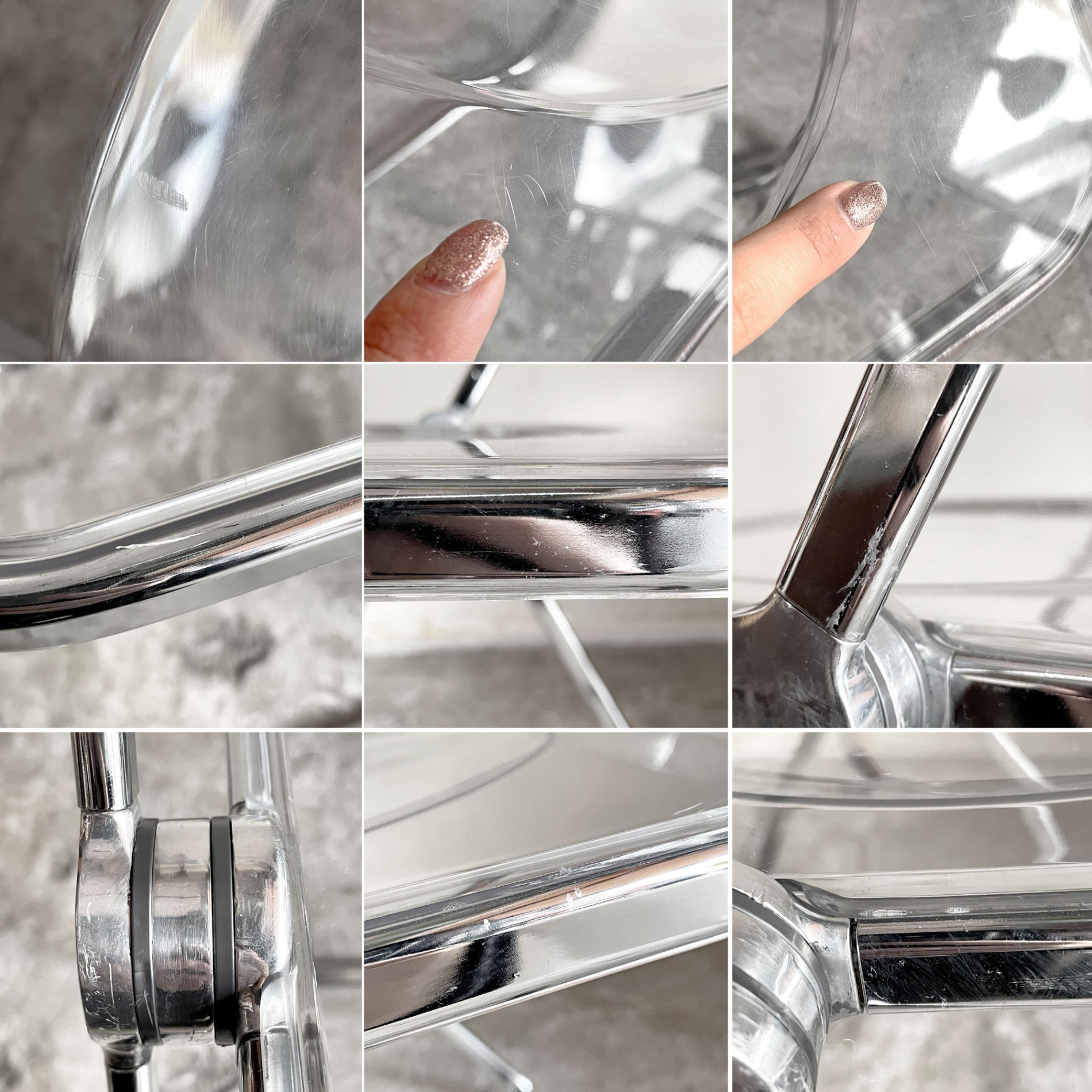 使用に伴う細かな擦れや傷、打痕が見受けられるほか、フレームと座面との隙間に取りきれない汚れがございます。また、背もたれ正面とサイド接続金具部分にシール剥がしに伴う擦れがございます。がたつきやぐらつきといった使用に問題となるダメージは無く、これからも安心して実用いただけるコンディションを保っております。