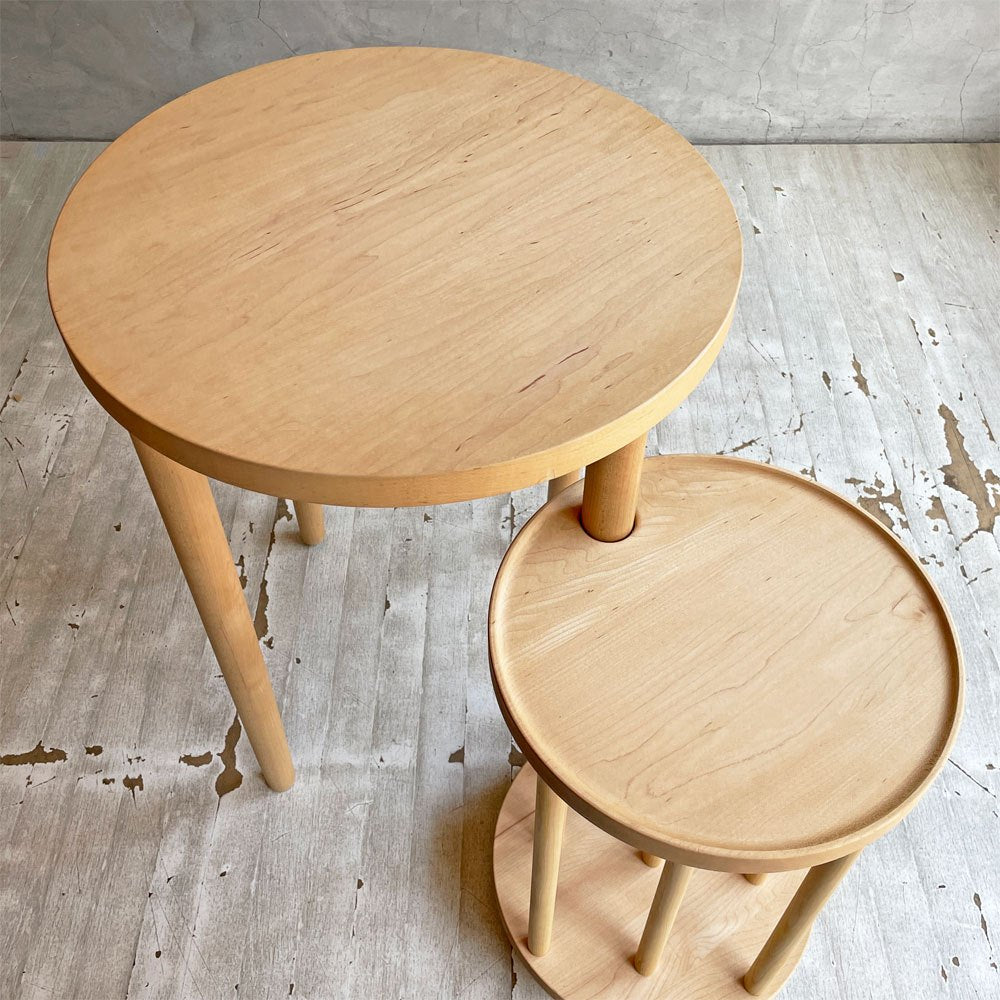 大テーブルの脚が小テーブルを貫通する独自構造で、軸を中心に自由にレイアウト可能。