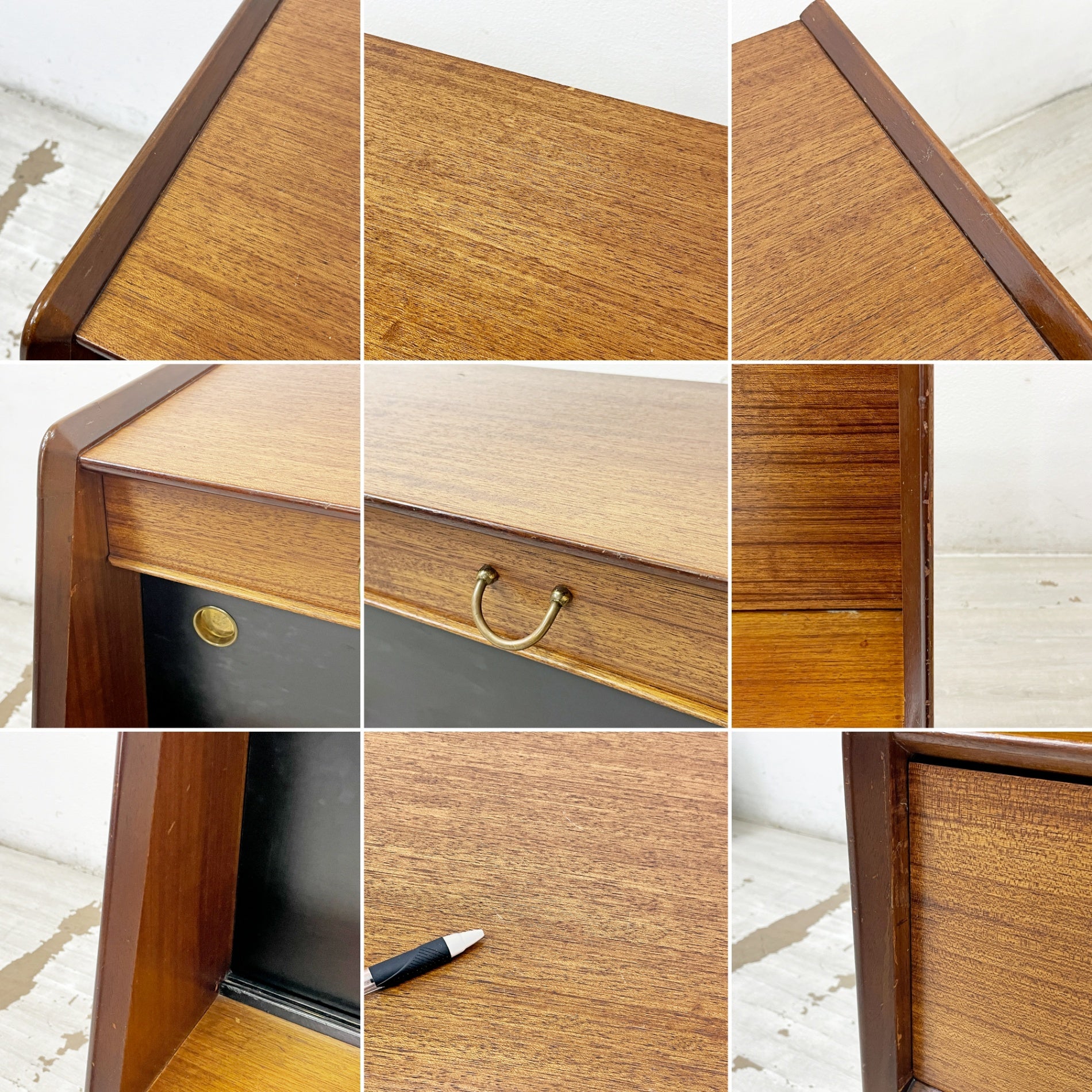 本体表面に擦れや線傷、打痕やペイントロス、真鍮にくすみ、スライド扉表面と内部に線傷や擦れ、塗料の白濁。抽斗内に擦れや線傷、背板に擦れ、脚部に擦れや線傷、打痕や塗料のくすみが見受けられます。