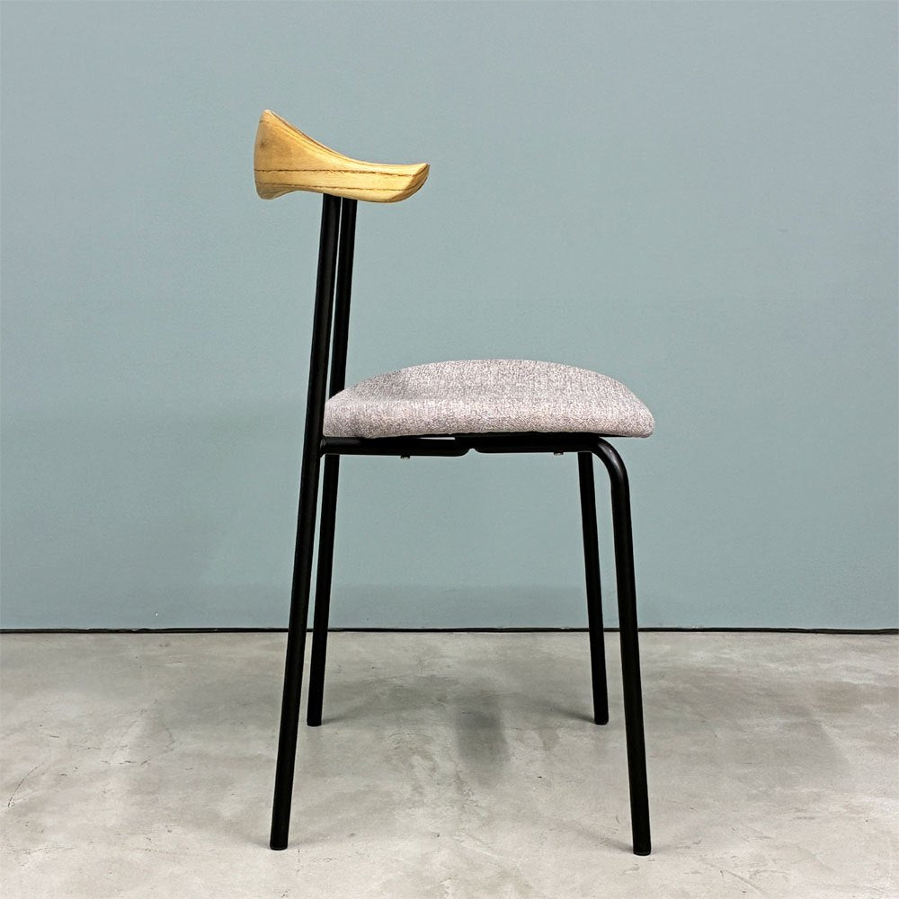 中でもアッシュ無垢材を動物の角のような形状に削り出した背もたれは大きな特徴となっています。