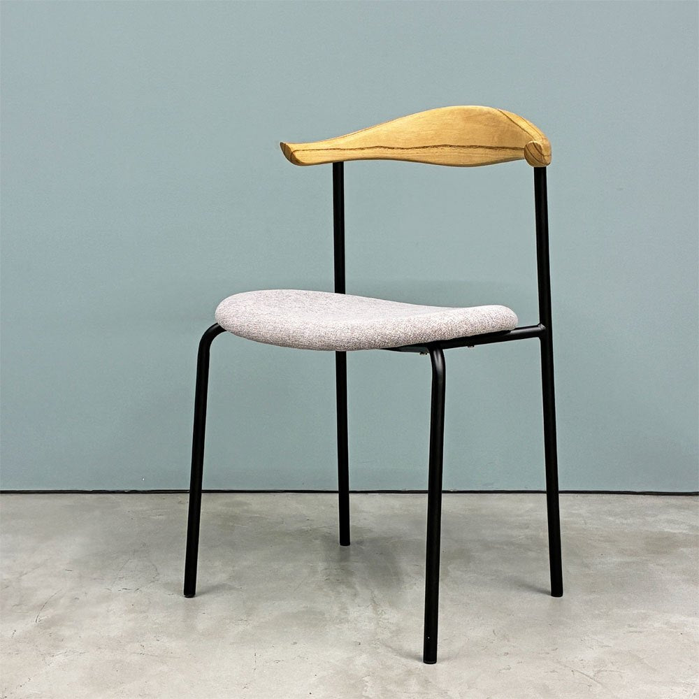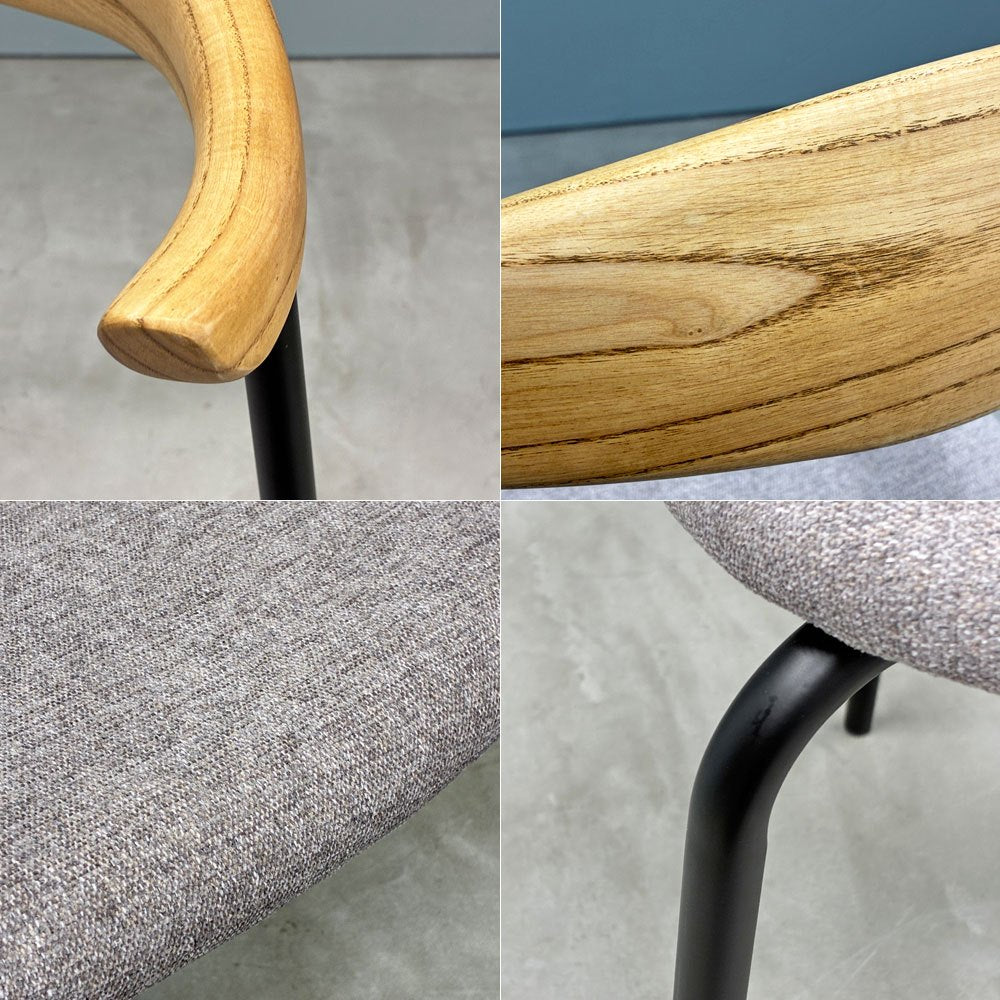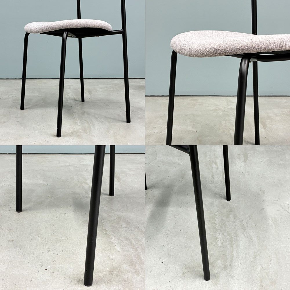線の細いスチール製フレームはダイニングシーンをすっきりと演出。ファブリックの張られた座面はその快適な座り心地を実現する事に加え、素材ならではの温かい印象を与える効果を果たします。