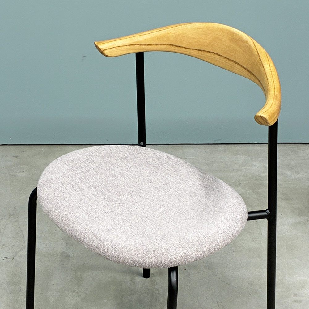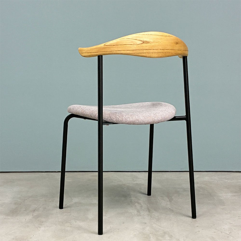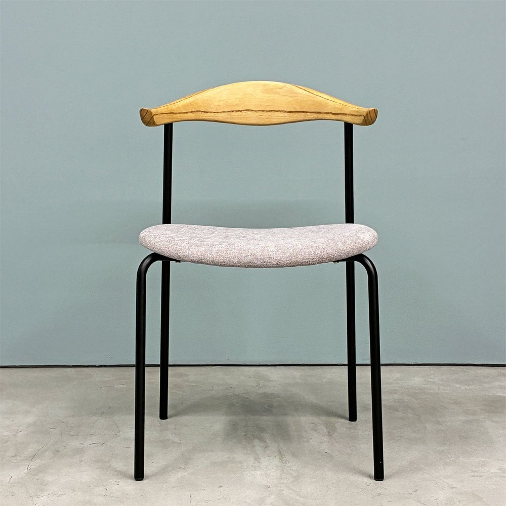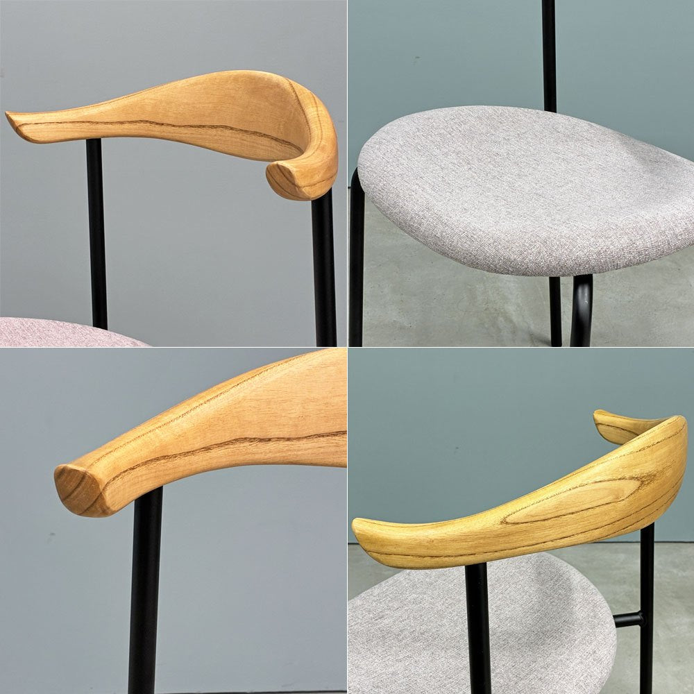 線の細いスチール製フレームはダイニングシーンをすっきりと演出。ファブリックの張られた座面はその快適な座り心地を実現する事に加え、素材ならではの温かい印象を与える効果を果たします。