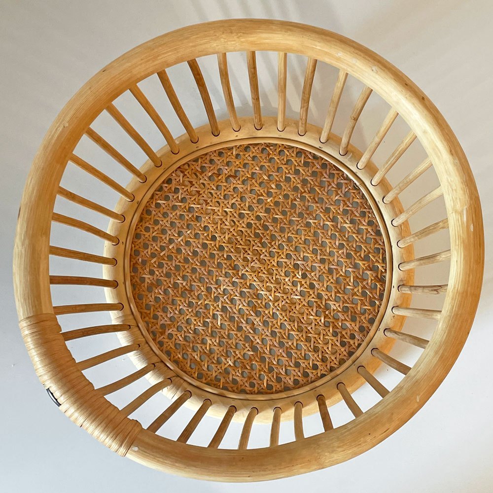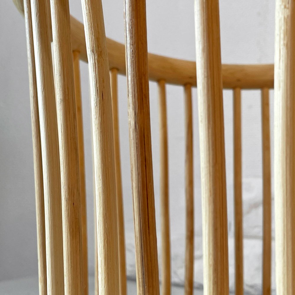 円形のフォルムデザインに対する縦のラインと底面のカゴメ編みの表情からは、作り手の意匠とコントラストの美学が感じられます。