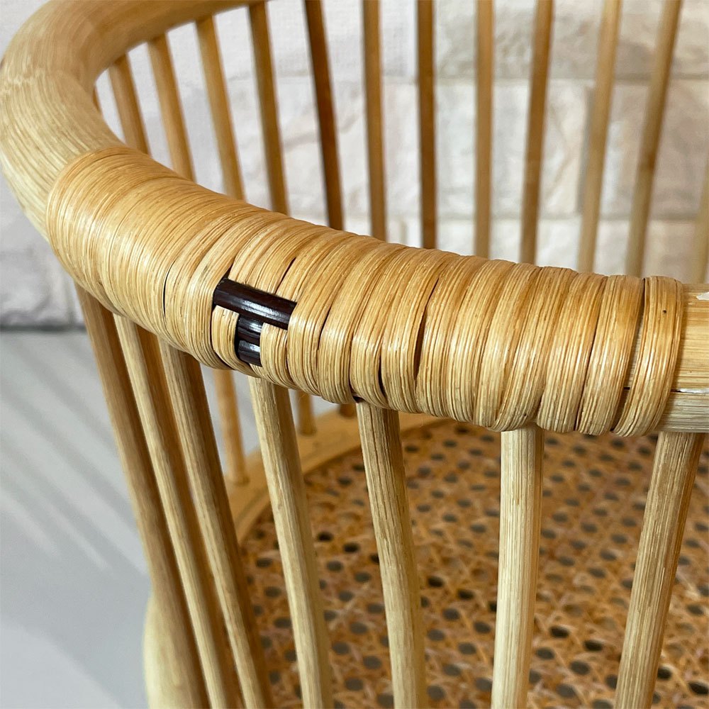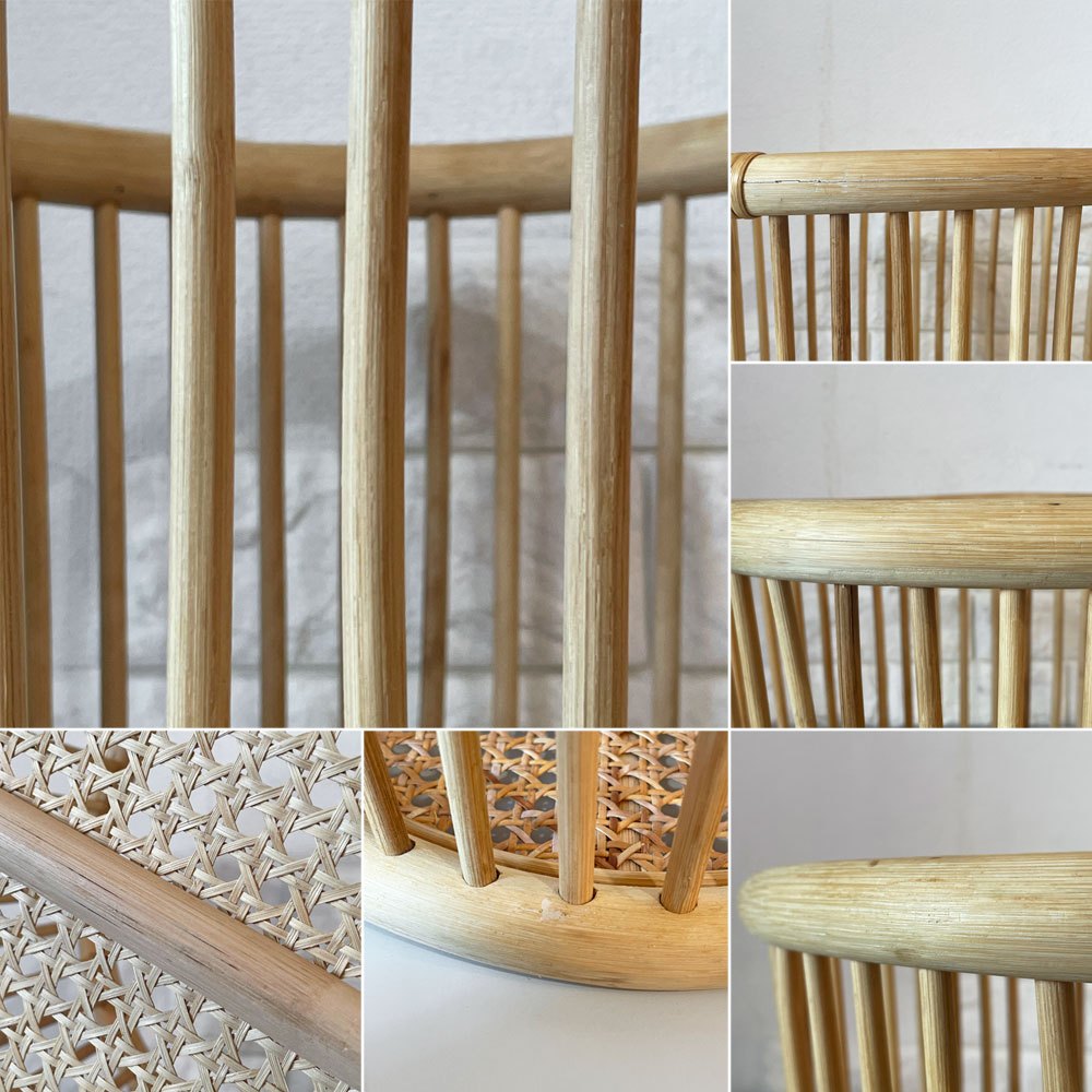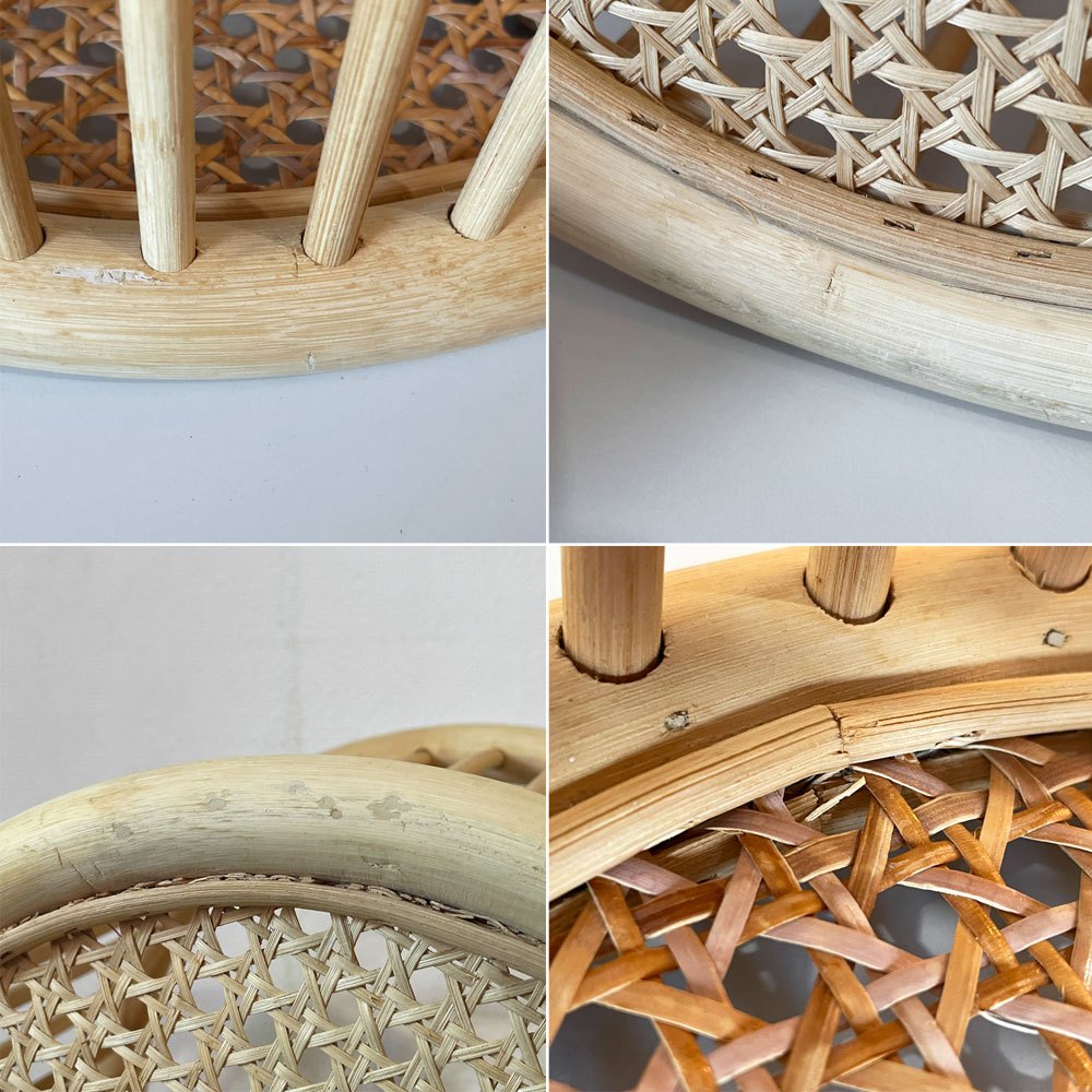 使用に伴い、木部に擦れや傷、打痕、色ムラ、黒ずみなどの取り切れない汚れがございます。また、籐部分には、ほつれや、取り切れない汚れが見受けられます。なお、裏面の貫部分は釘で固定されているもので、製造時の打ち損じがあり、片側が固定されていない状態です。そのため強く押したり、引っ張ったりすると外れてしまう恐れがあります。その他、使用に問題となる大きなダメージはなく、まだまだ実用いただけるコンディションを保っております。