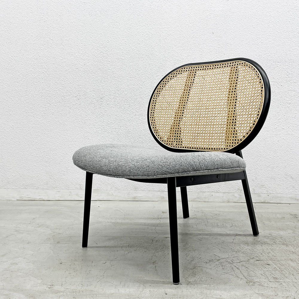 背もたれと座面の形状から、コロンとした可愛らしいフォルム。フレームは黒、座面はグレーのファブリックとモダンな色合いに、背もたれをラタンが加わる事でどこかレトロな雰囲気も兼ね備わっています。