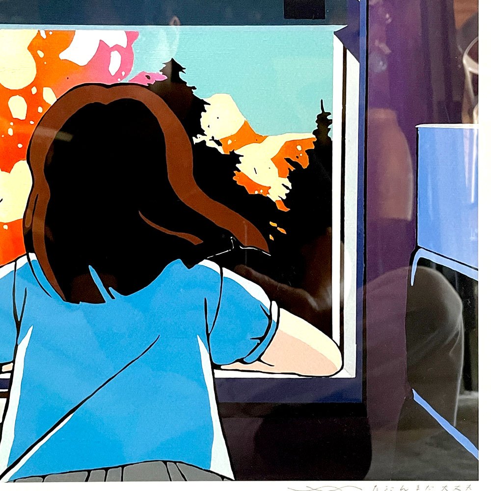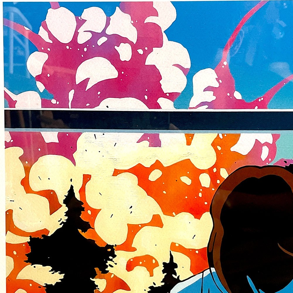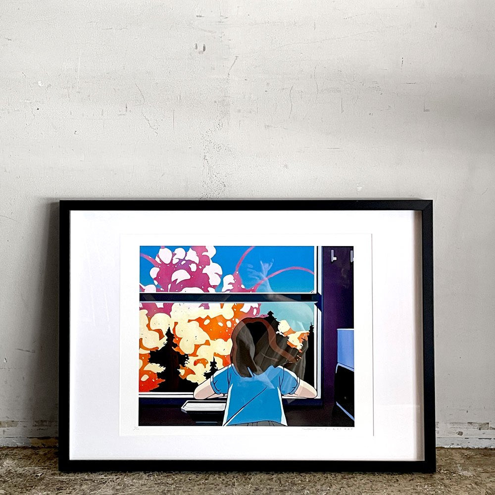 90年代前後のアニメ作品を彷彿とさせる色使いで、少女の後ろ姿と車窓というのどかな1シーンと窓の外で起きる大爆発という対比が効いた構図になった作品です。