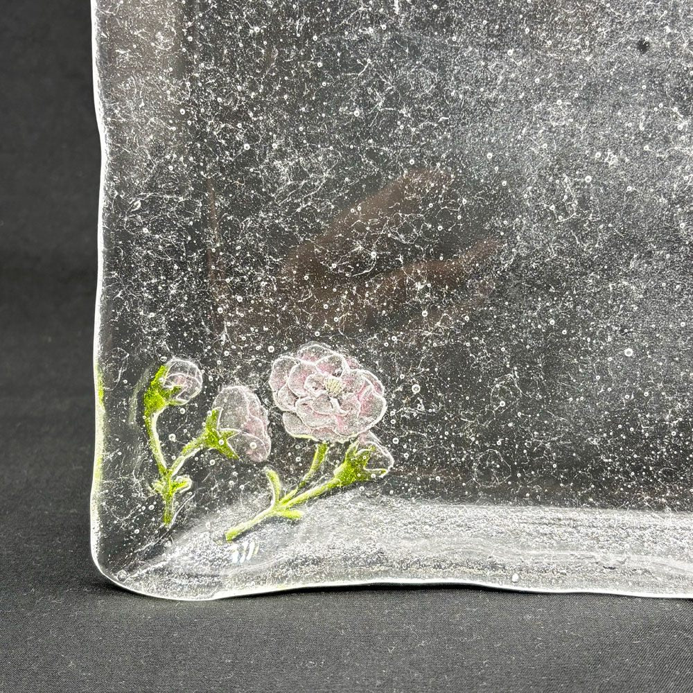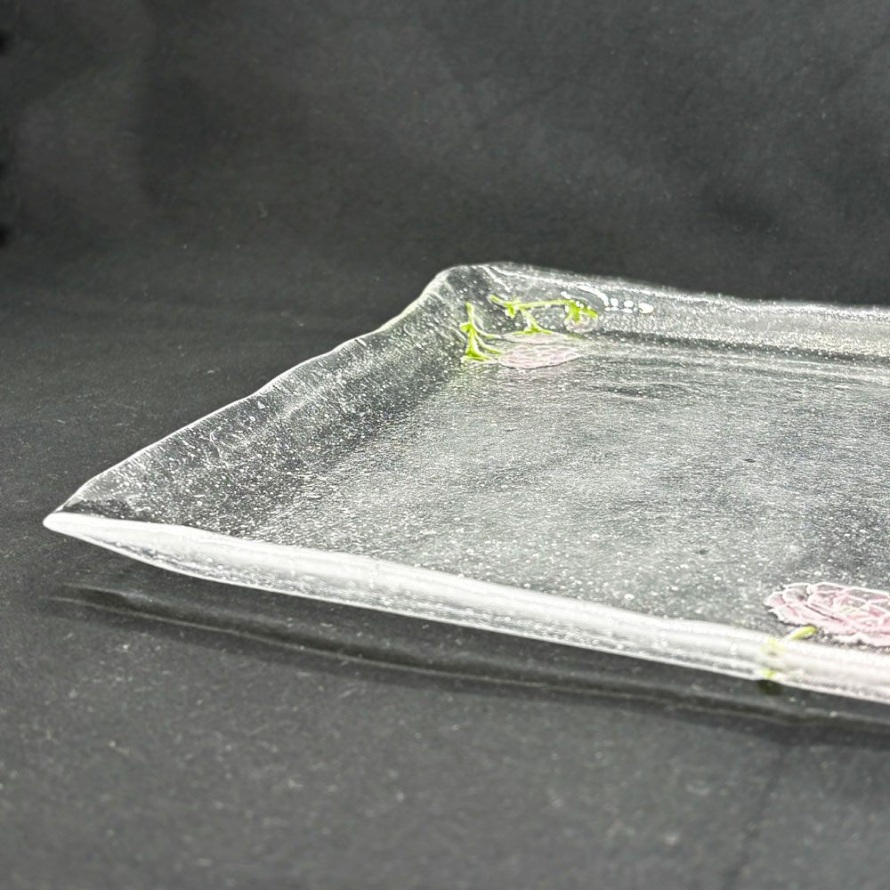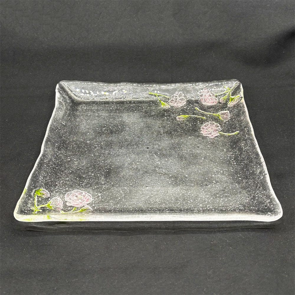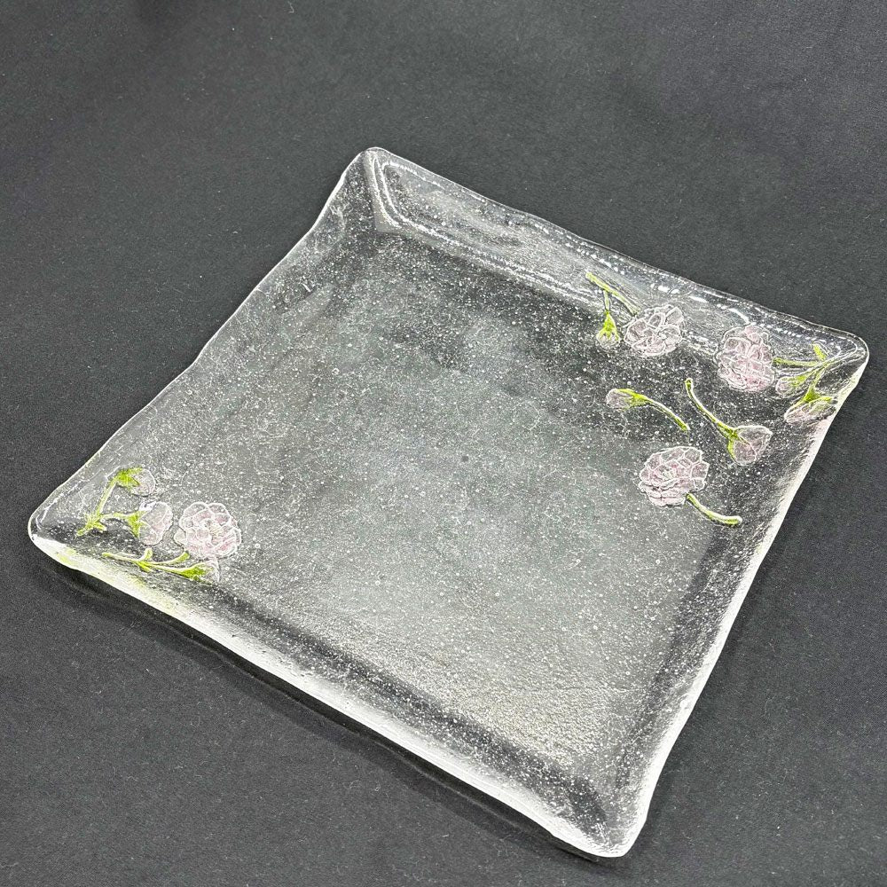 岡田多恵 ガラス 角皿 スクエアプレート パートドヴェール 花 24cm 現代作家 ●