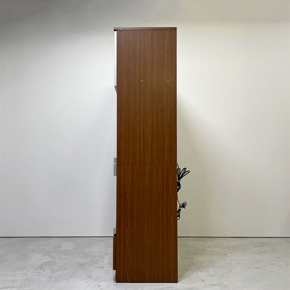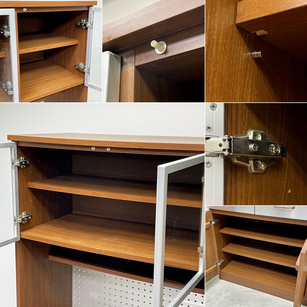 上段にはお気に入りの食器類などを飾りながら収納出来るガラス扉の棚。中段のオープンスペースには天板に熱や汚れ・水に強いステンレスを使用。コンセントも備わっており、電子レンジやコーヒーメーカー等の家電の設置が可能。なお天板は引き出すことができるため、炊飯器などの上に蓋が開く家電にも対応しております。