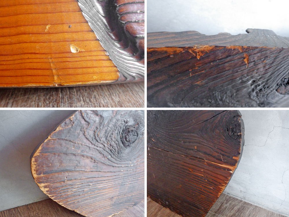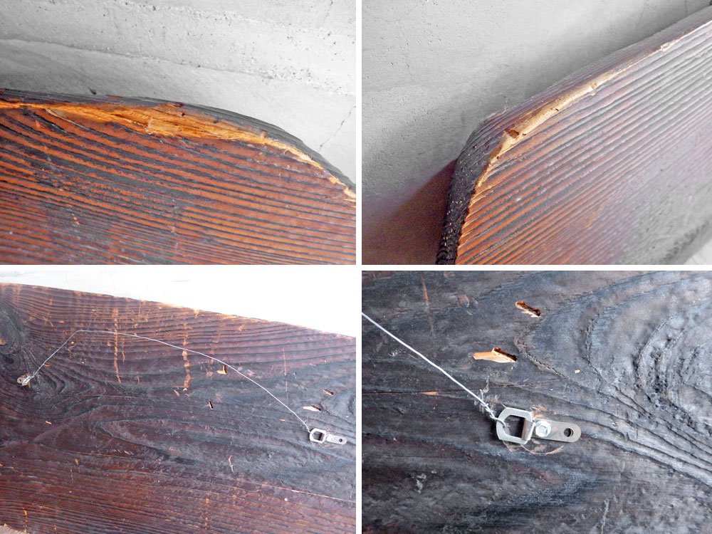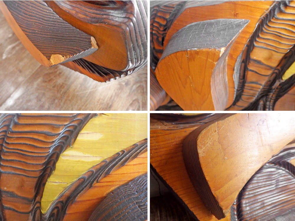 若干の傷やスレなどがございます。また、木材結合部に若干の浮きや塗装のムラなどがございますが、大きく目立つようなダメージなどもございません。全体的に良好なコンディションを保っております。