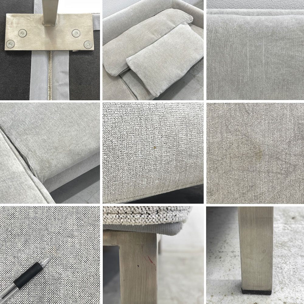 ファブリック全体に黄ばみや点状の染みが散見されます。また、僅かに生地の縮みも生じている為、場所によってヨレがのある箇所もございます。その他、ヌードクッションの染みや脚部のくすみ等、多少の使用感はあるものの気持ちの良い座り心地に衰えはございません。今後も十分実用頂けるコンディションを保っております。