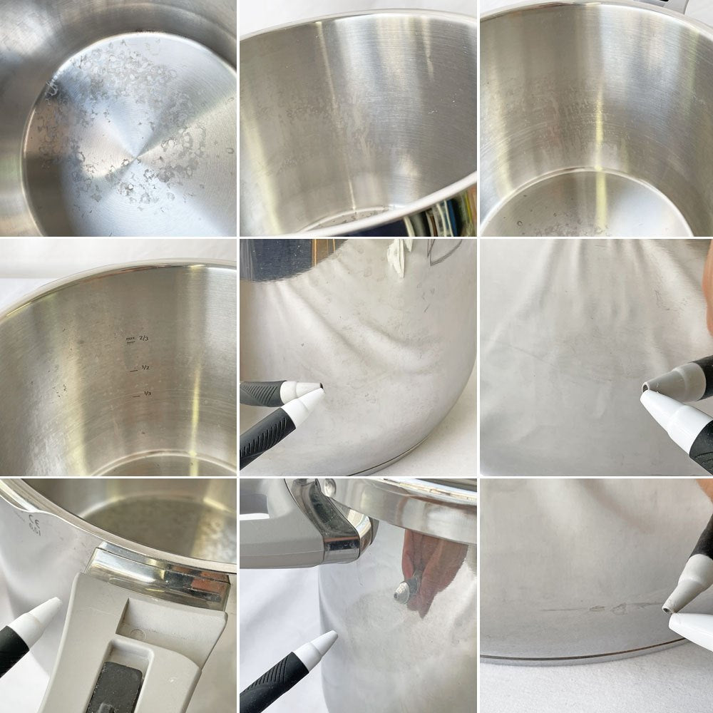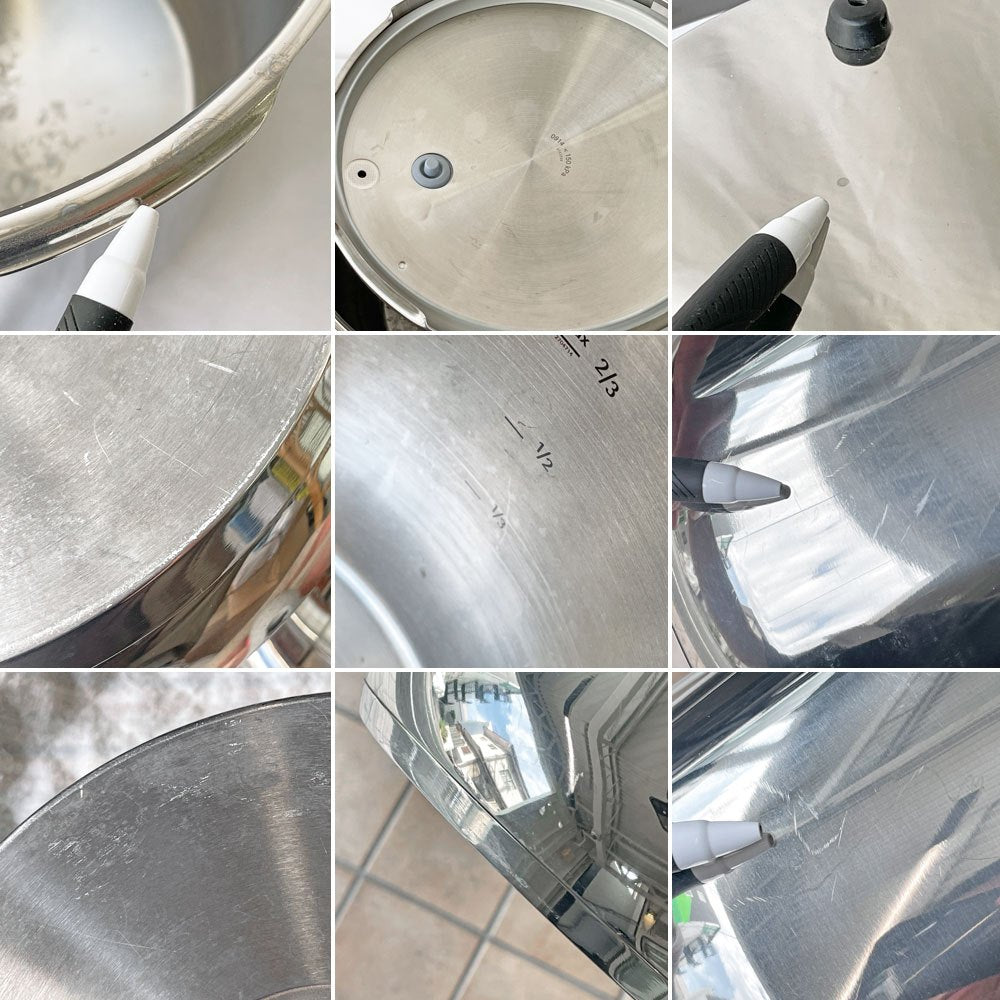 こちらはドイツ製の圧力鍋『 レインボークッカー 』。ステンレスでアルミニウムをはさんだ3層の多層底で作られ、本体裏面には電気コンロ、ガスコンロ、セラミックヒーター、IHクッキングヒーターでの調理可能の熱源表記が刻印されています。