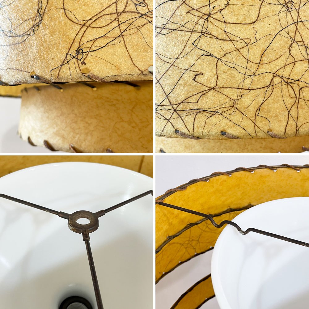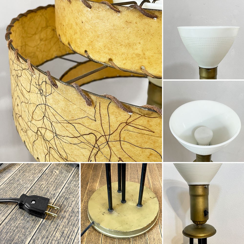 こちらはビンテージのお品物です。ファイバーシェードには経年による色味の変化や細かなペイント痕が全体にございます。また、ベース部分には擦れや傷、ペイントロス、くすみや錆等の取り切れない汚れが散見されます。シェードの紐は革製のものと交換されている箇所がございますが、美観を損なうものではございません。その他、スイッチがやや固く感じられるものの点消灯に不具合はございません。経年なりのダメージがございますが、これからもビンテージの風合いをお楽しみ頂きながらご使用いただけるコンディションを保っております。