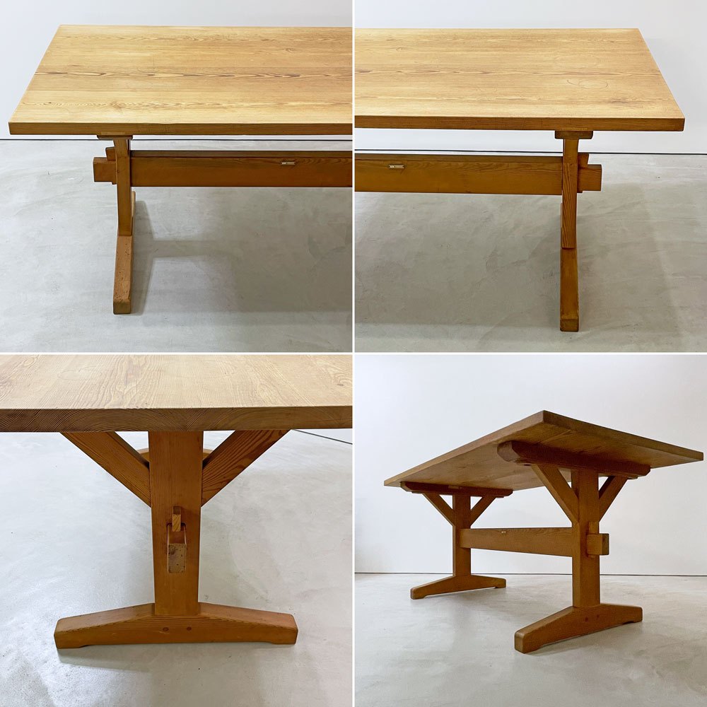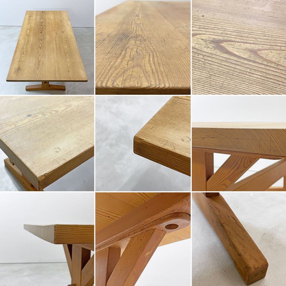 使用に伴い、木部の傷や擦れ、欠けや打痕、天板の輪染みや取り切れない汚れ等が全体に見られます。天板は経年により無垢材特有のクラックがあり、僅かに反りもみられますが、美観を著しく損なうダメージはなく、接合部も確りとしており揺れやガタツキ等もございません。今後も安心してご使用いただけるコンディションを保っております。