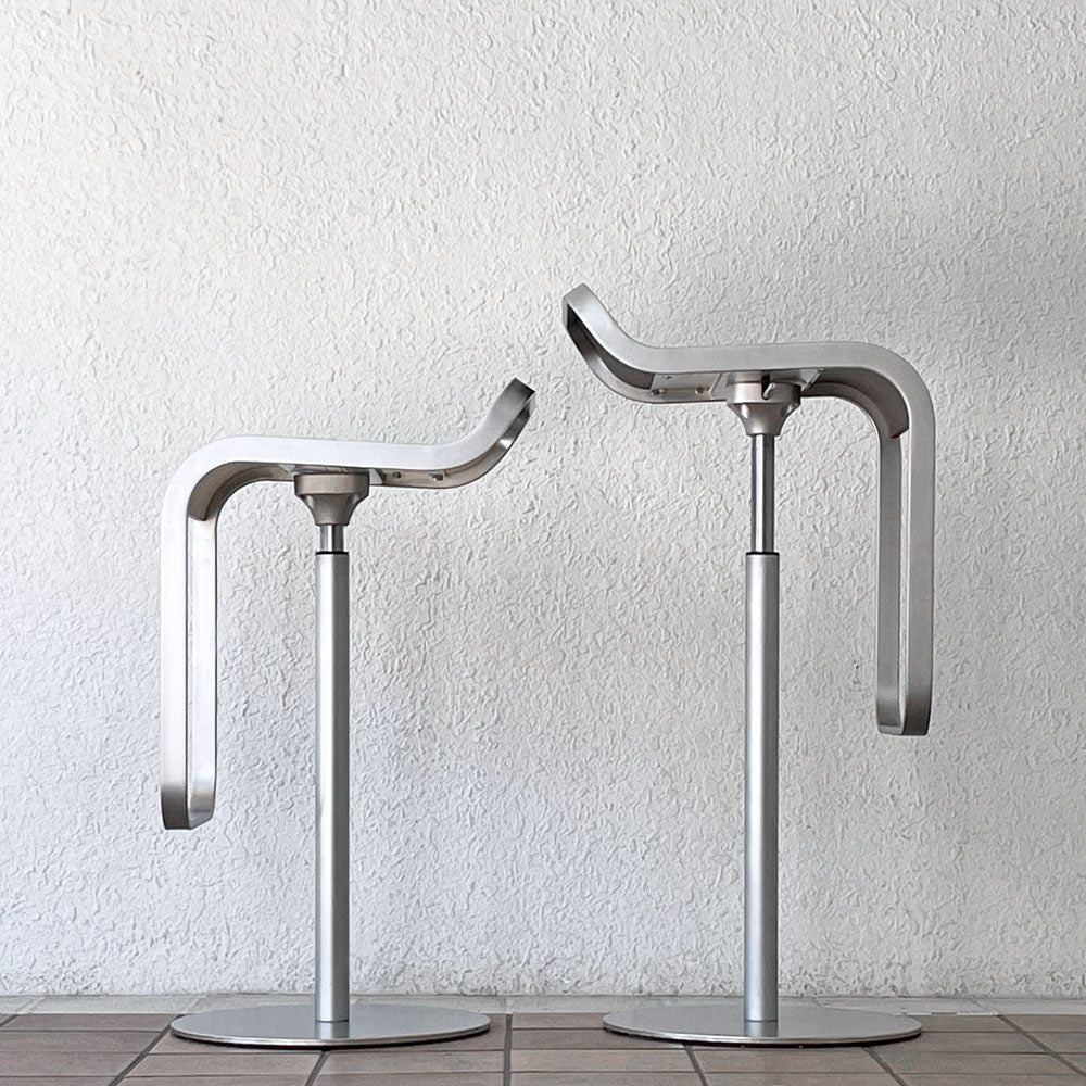 美しい曲線を描くフォルムは、座面とフットレストを同一のフレームにより構成されています。昇降機能を備えておりますので、カウンターテーブルの高さやユーザーの体格に合わせて調整頂けます。