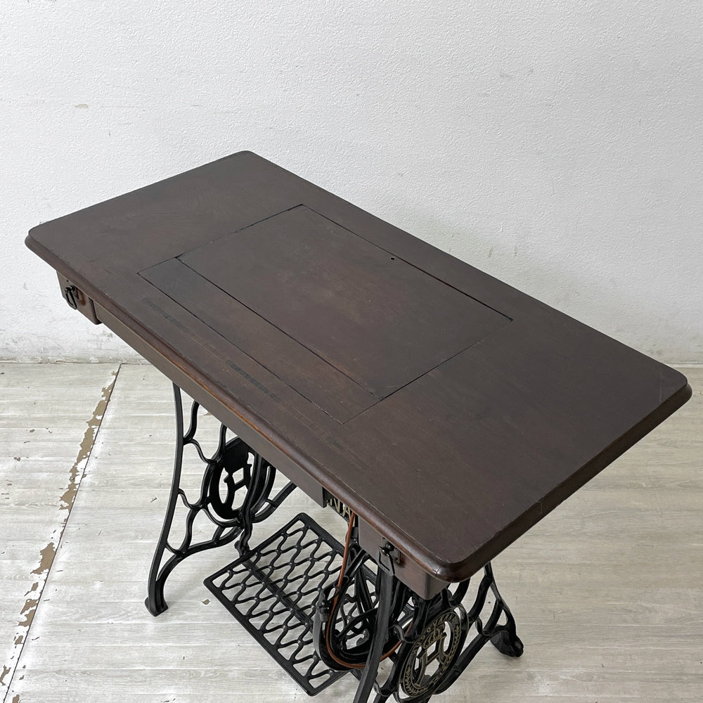 こちらはビンテージのお品物です。天板に染みや打痕が見受けられ、ミシンには擦れによるペイントロスや錆がございます。また、天板下のミシン格納部分の表面突板には剥がれ、抽斗の底板には乾燥による割れも生じている等ビンテージ相応のコンディションではございますが、雰囲気を損ねる様なダメージはございません。