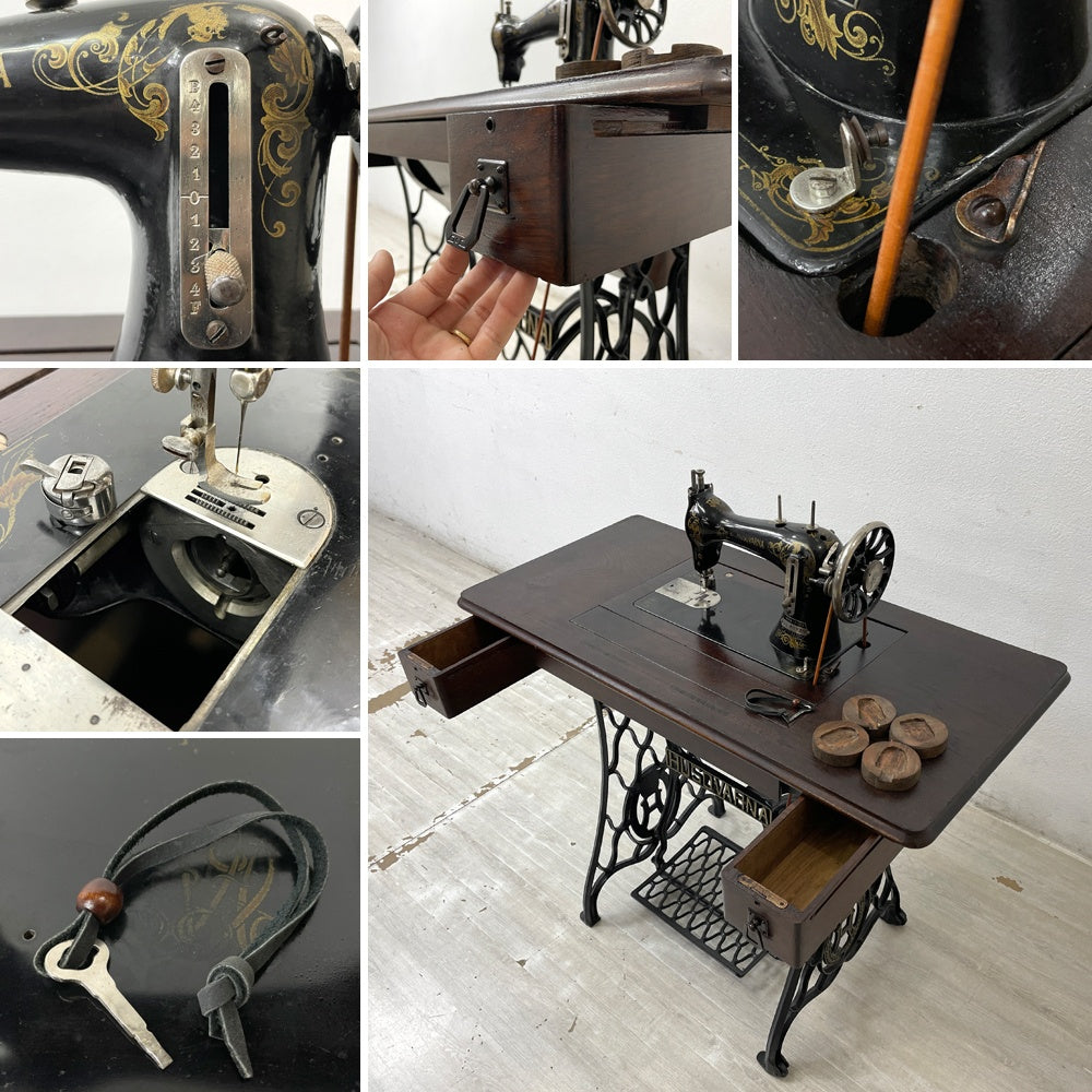レザーのベルトは切れておらず、回転は良好。針の上下も確認できておりますが、古いお品物でございますのでインテリアとしての販売とさせていただきます。機能的な不具合については保証出来かねますので予めご了承くださいませ。