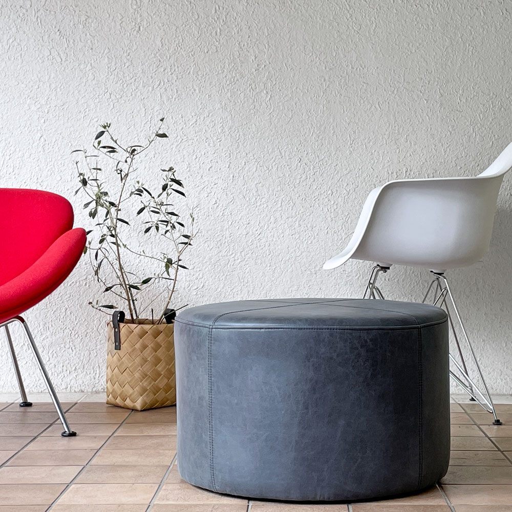 スーパーレザーテックス生地によるリアルなレザーの質感、さらりとした肌触りも心地よく、スツールとしては大きな径Φ60cmの座面を備えているのでゆったりとした座り心地でお楽しみいただけます。