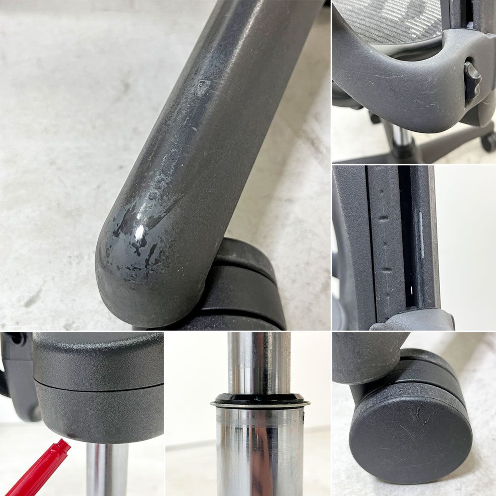 使用に伴い、フレームや脚部に擦れや傷、表面コーティングの剥がれ、取り切れない汚れが見受けられます。機能面ではガス圧がやや弱くなっているように感じられ、着座時にわずかに沈み込みが見られます。なお、それ以外に使用に支障をきたすような大きなダメージはなく、各機能も問題なくお使いいただけます。全体として、これからも安心して実用いただけるコンディションを保っております。