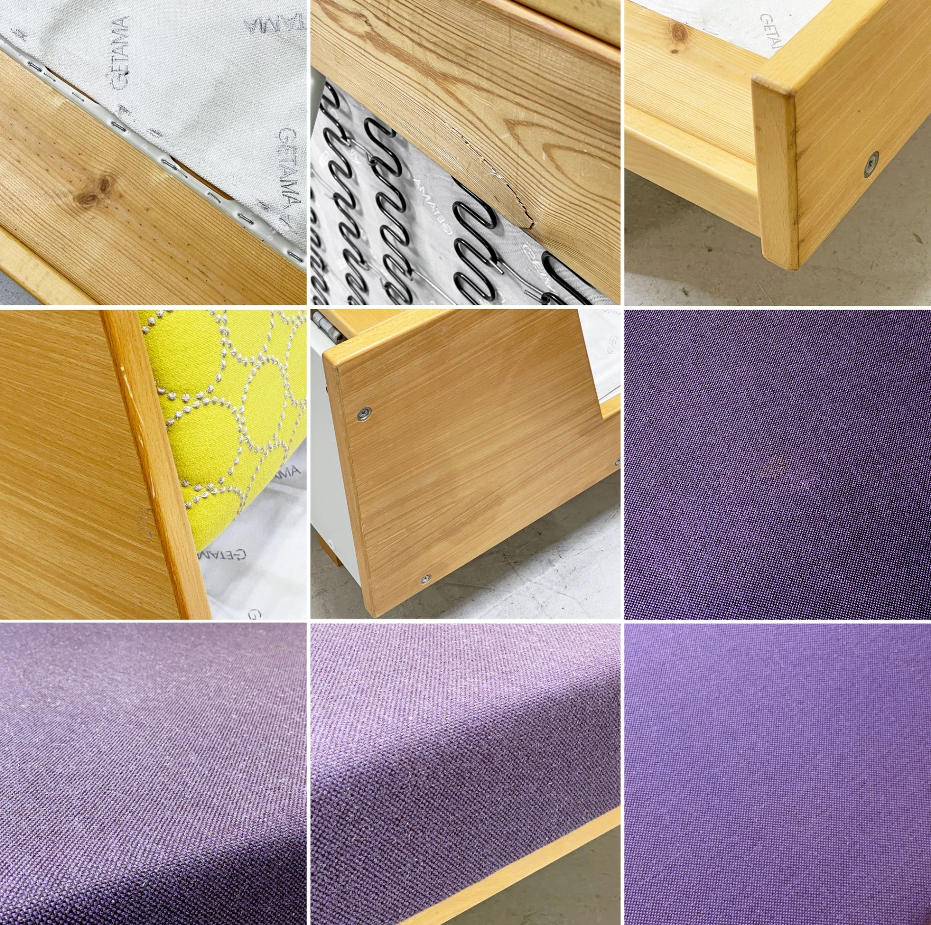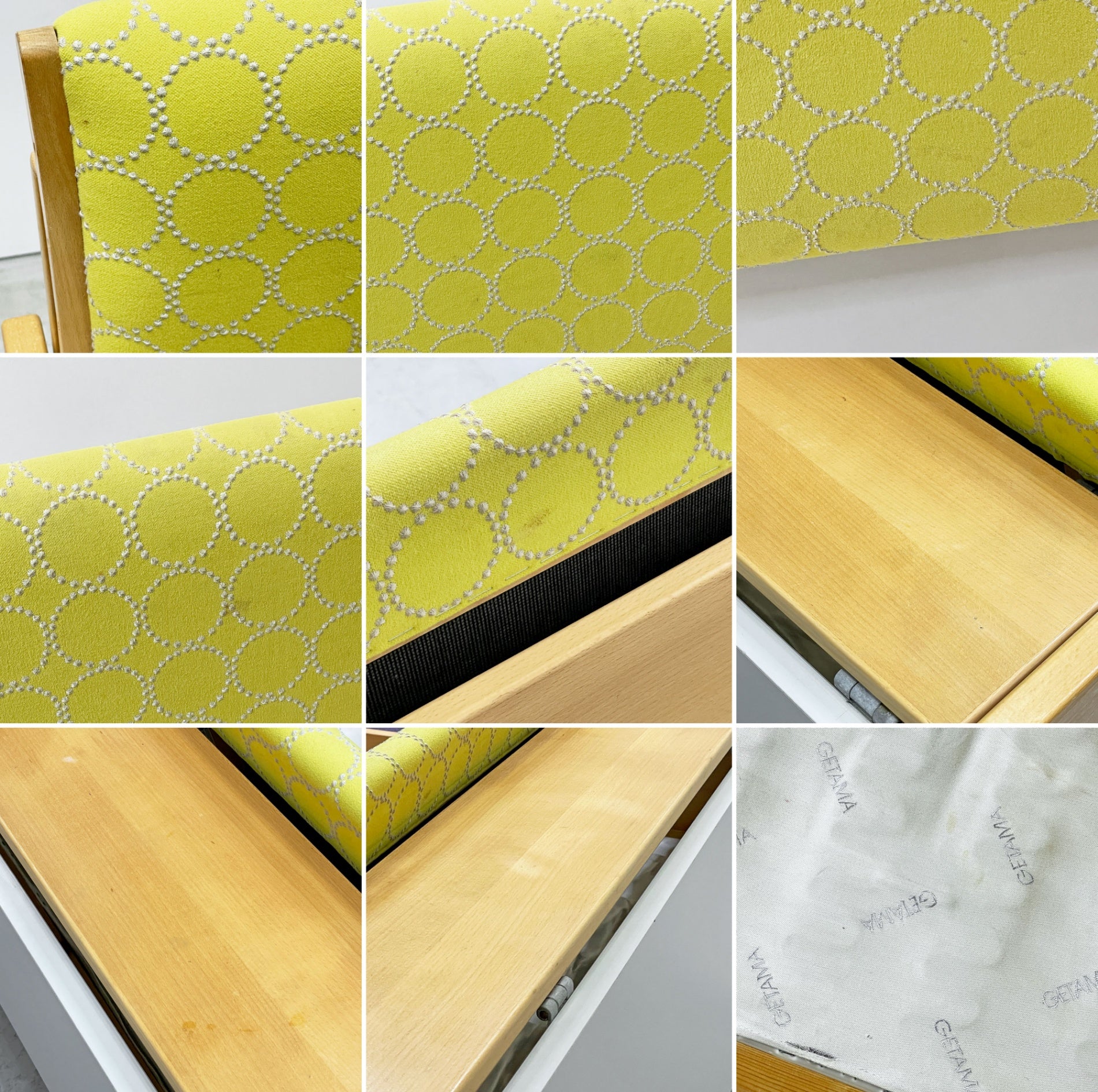 使用や経年に伴う、ファブリックのシミ汚れや僅かな毛羽立ち、フレームには傷や擦れ、角部の打痕、色褪せ、くすみ、落とし切れない汚れが散見されますが、いずれもビンテージならではの風合いとしてお楽しみいただける程度の物かと思われます。