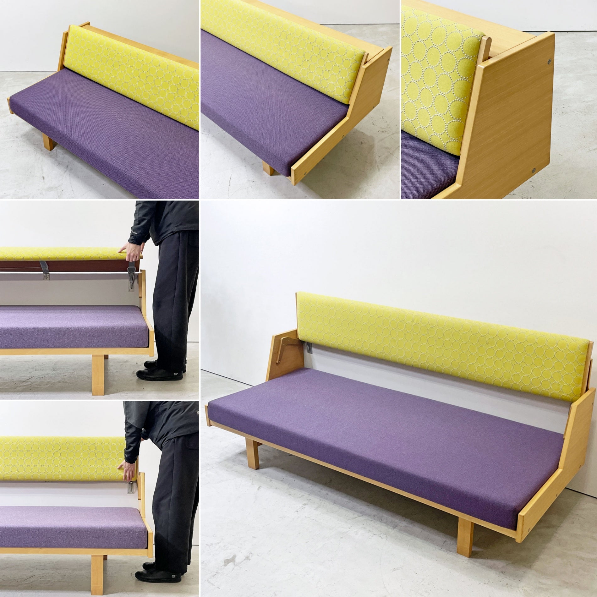 こちらのデイベッドは学生寮の設備として開発されたもので、背もたれを持ち上げることで寝転がるのに十分なスペースが現れるという、ソファとベッドを一台に集約した省スペースなモデル。