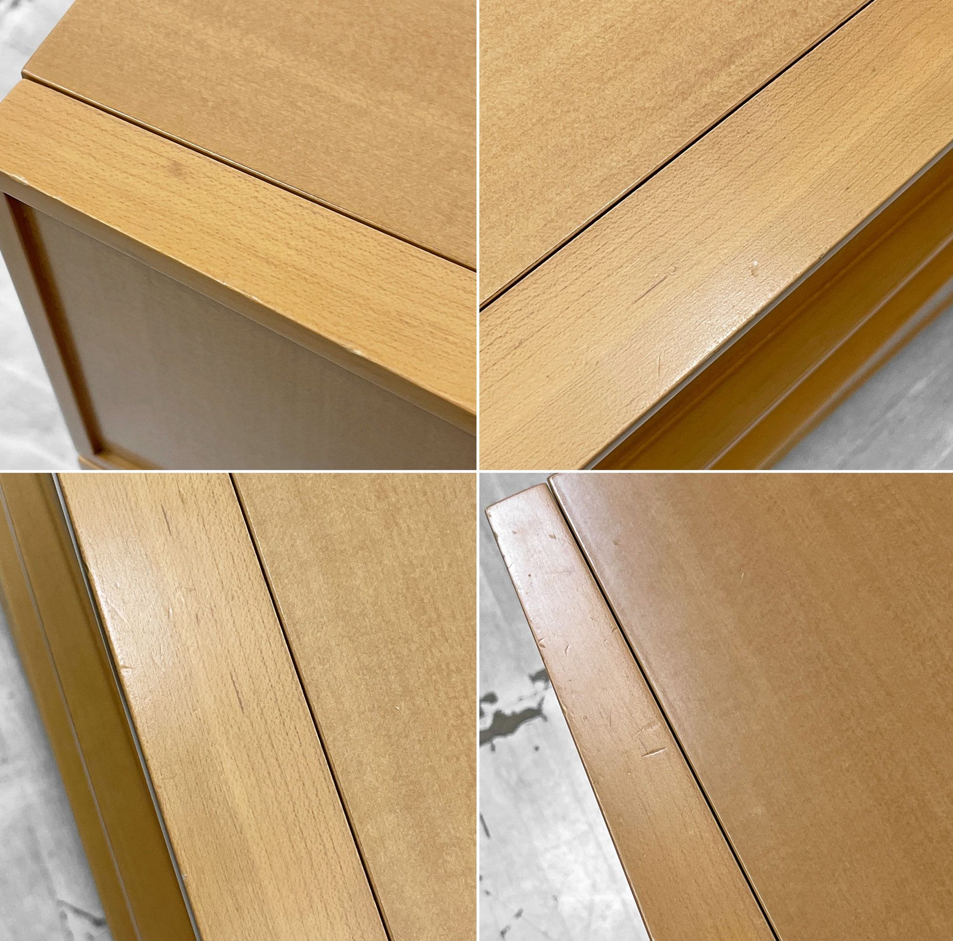 使用に伴い、天板に擦れや小傷、突板の浮きによる凹凸が一箇所、角部に微細な打痕、側面の下部に擦れ、抽斗内部には極僅かな落とし切れないペイント汚れが見受けられます。