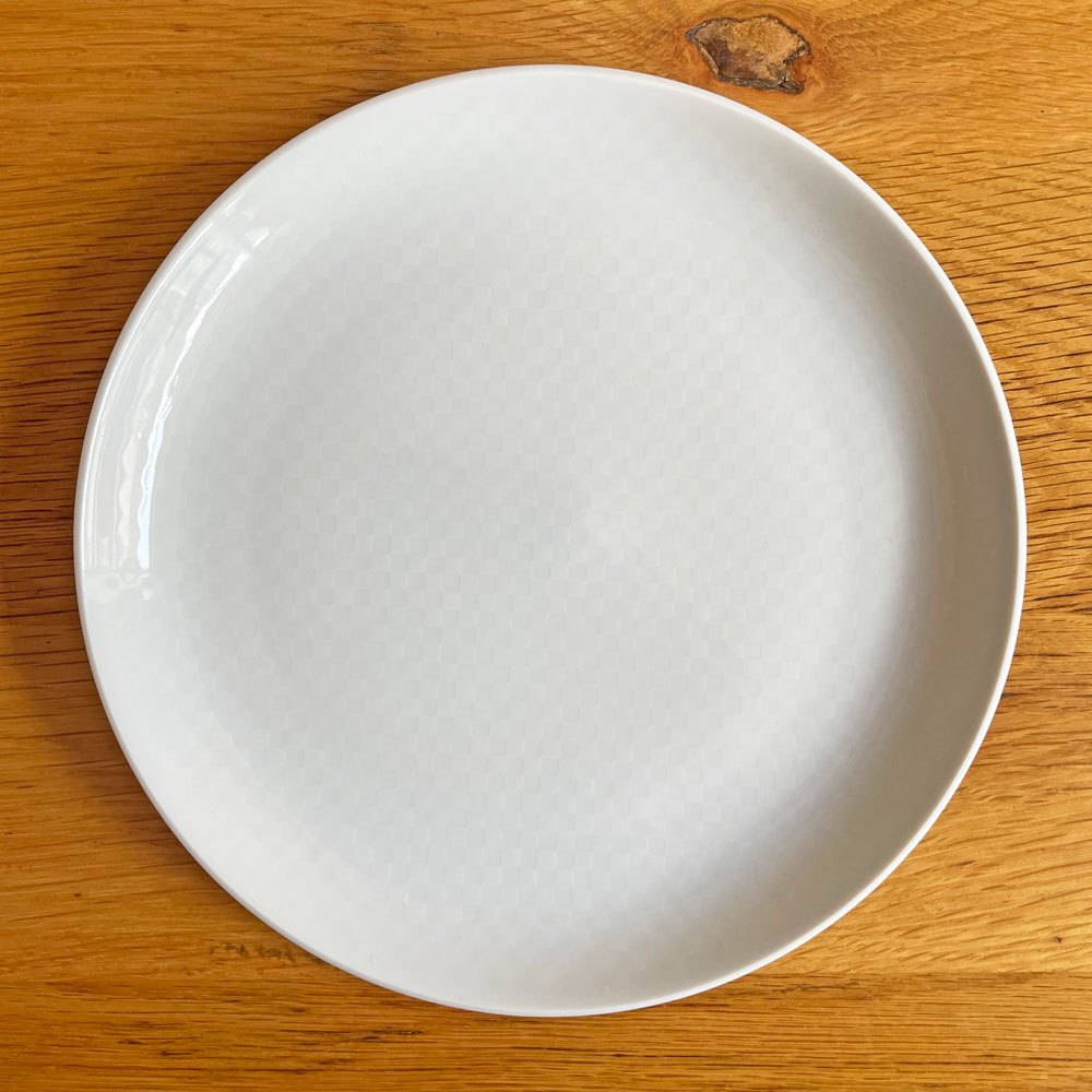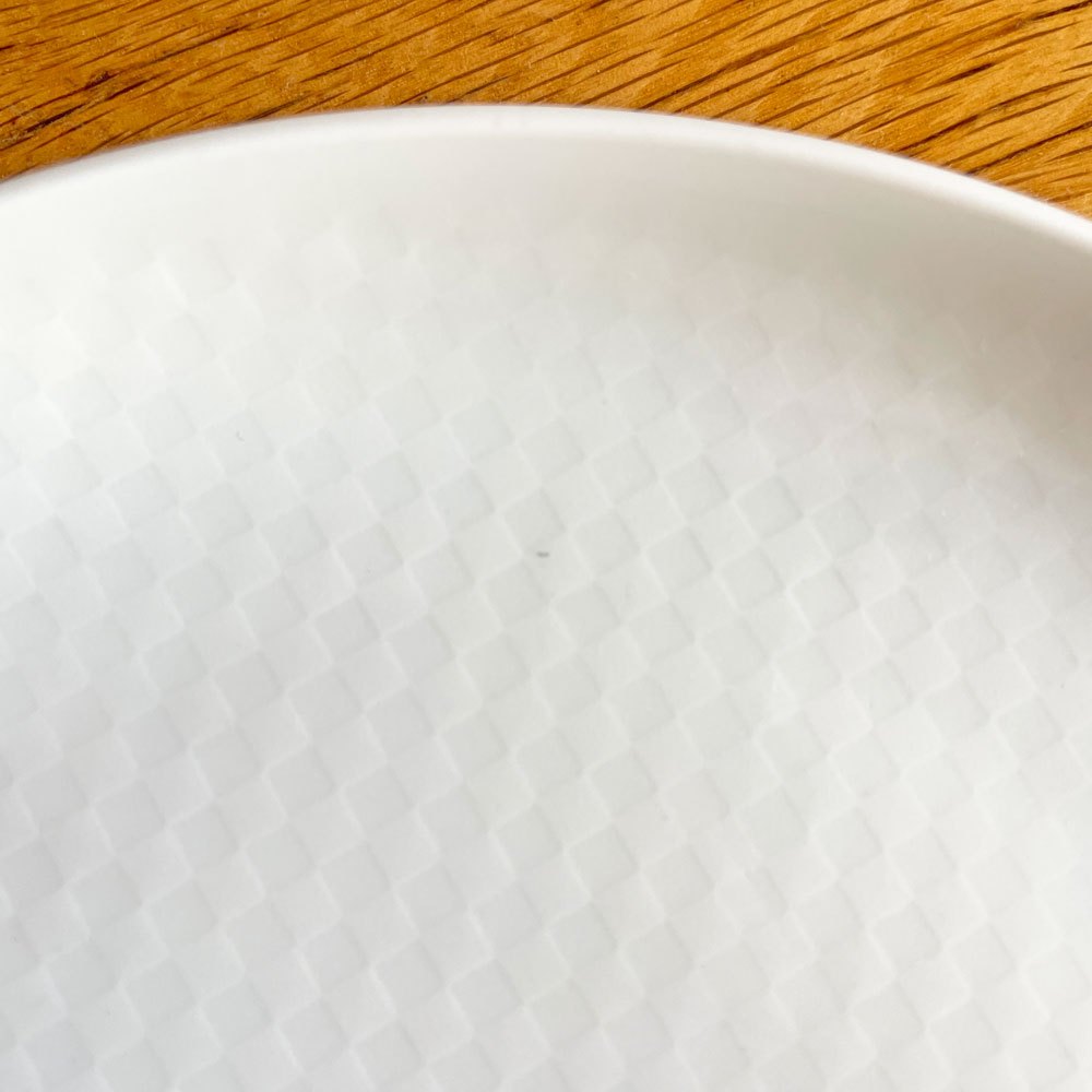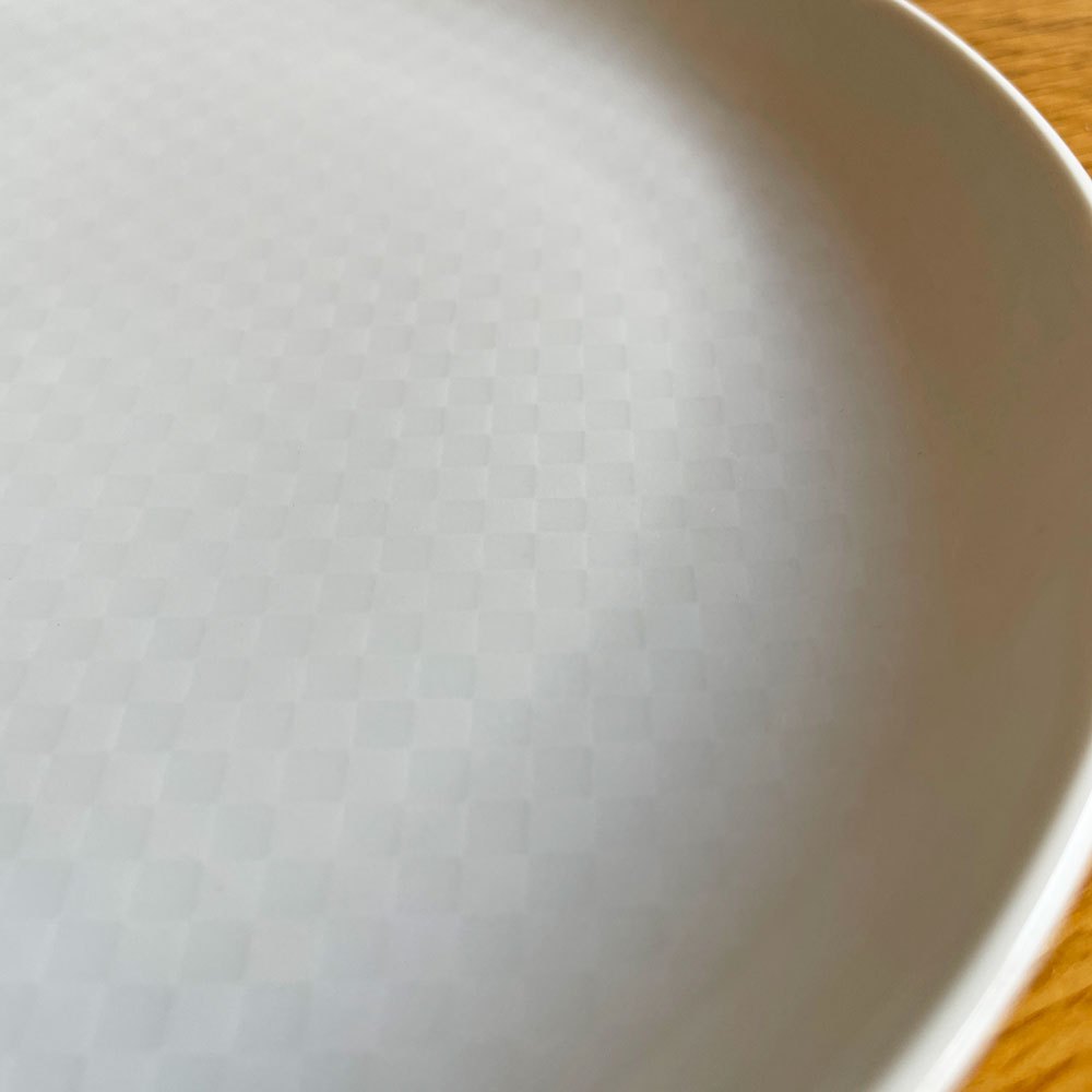 一見シンプルな白磁のプレートに見えますが、光に反射させると格子模様の型押しが浮き彫りになります。