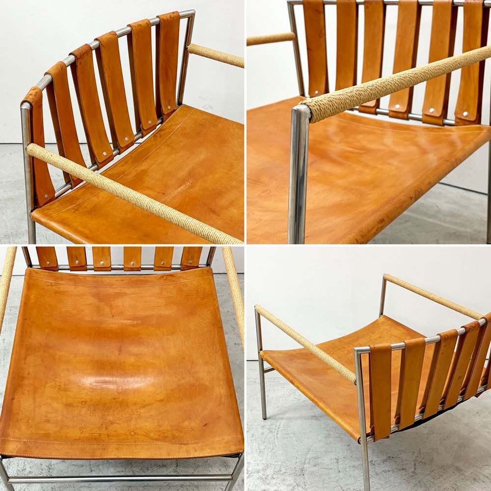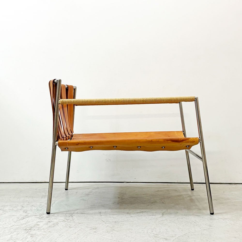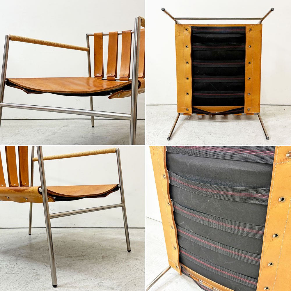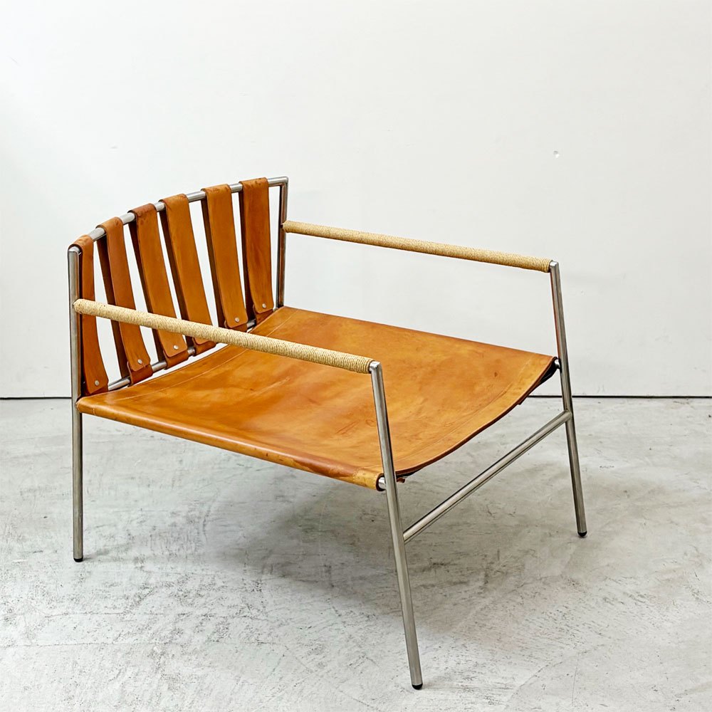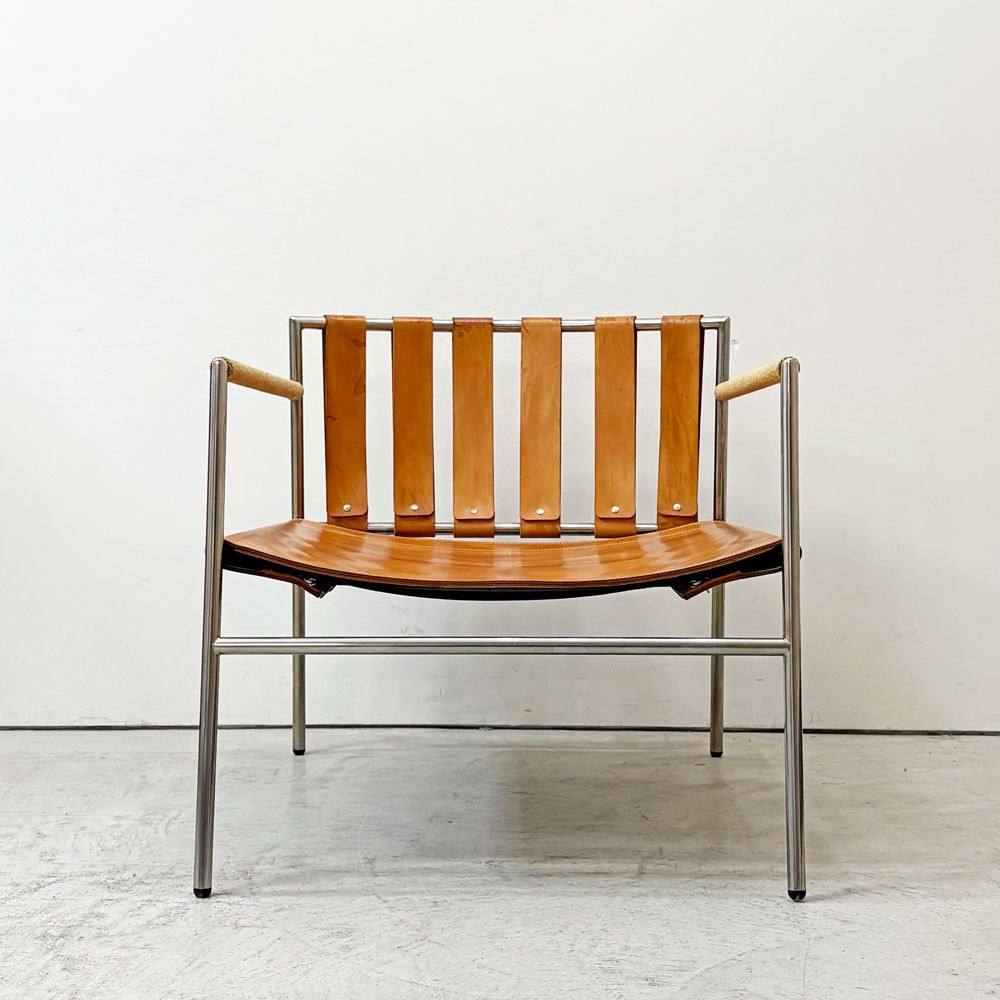 ステンレスの洗練された輝きと、本革の経年変化による豊かな表情。使い込むほどに味わいを深めるイージーチェアです。