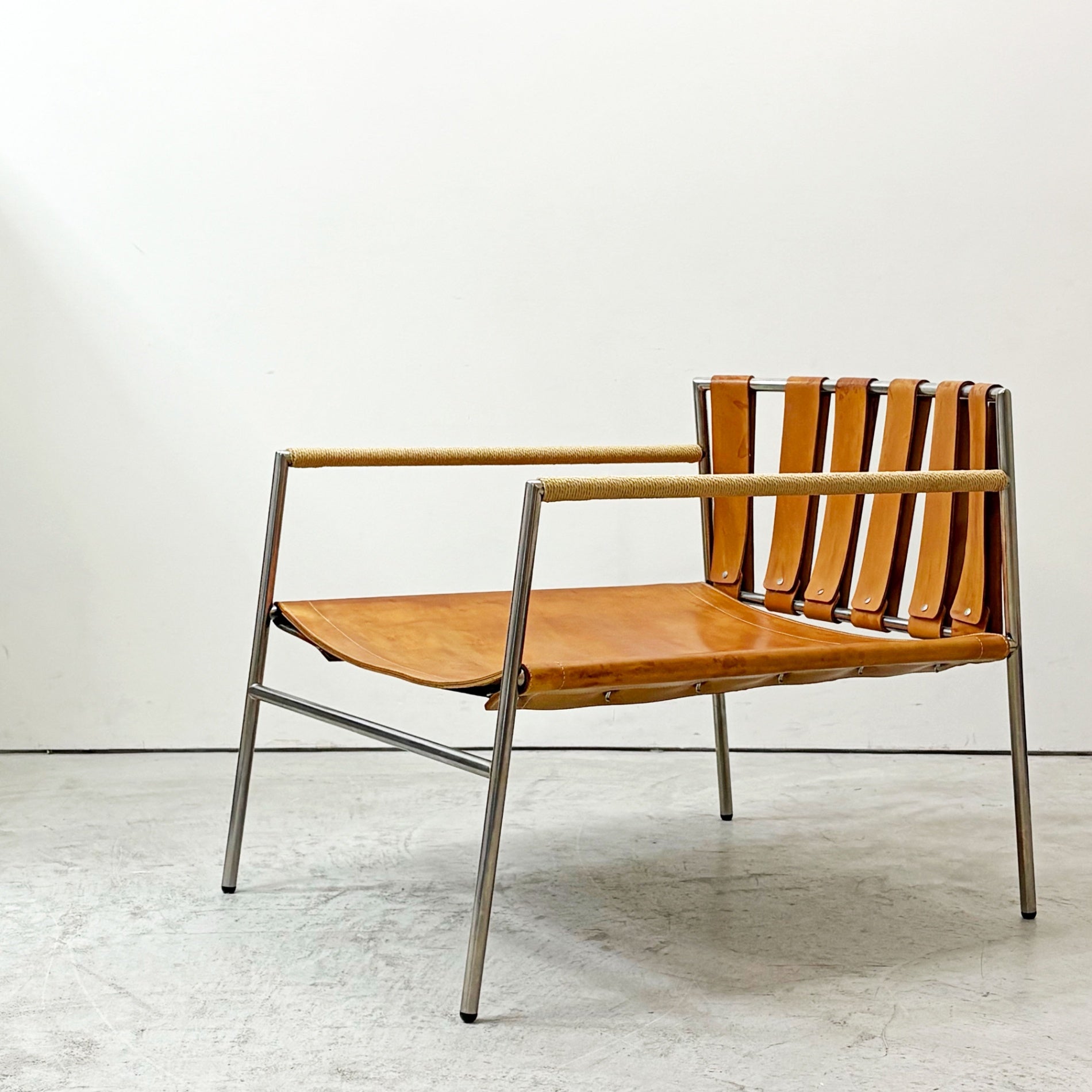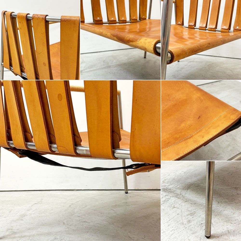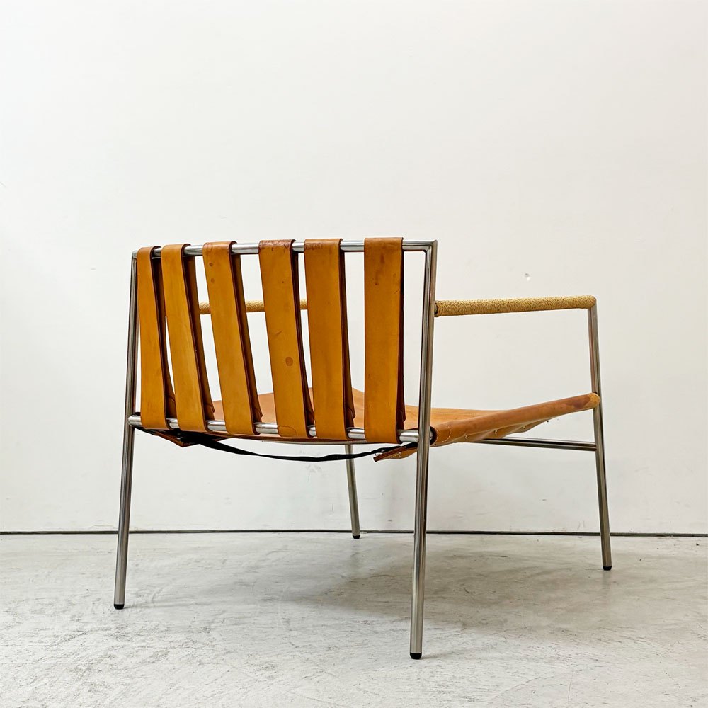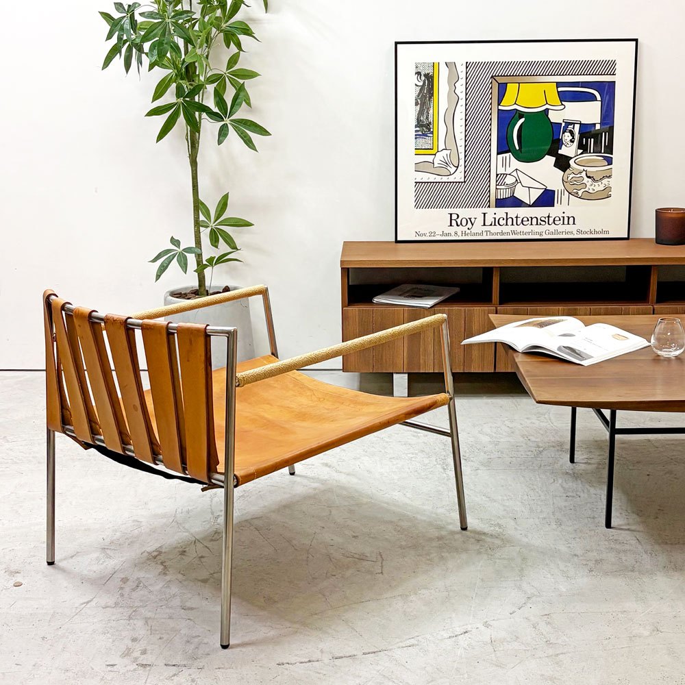 ステンレスの洗練された輝きと、本革の経年変化による豊かな表情。使い込むほどに味わいを深めるイージーチェアです。