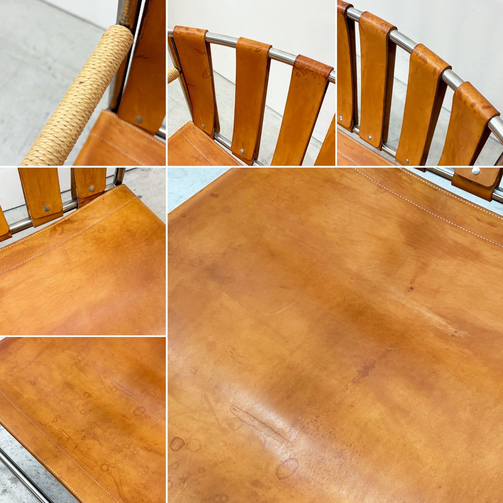 使用に伴い、レザーにシミや汚れ、革特有の僅かな臭い、フレームに素材特有のくすみ等が見受けられます。また、座面裏ウェービング一本に緩みが生じております。