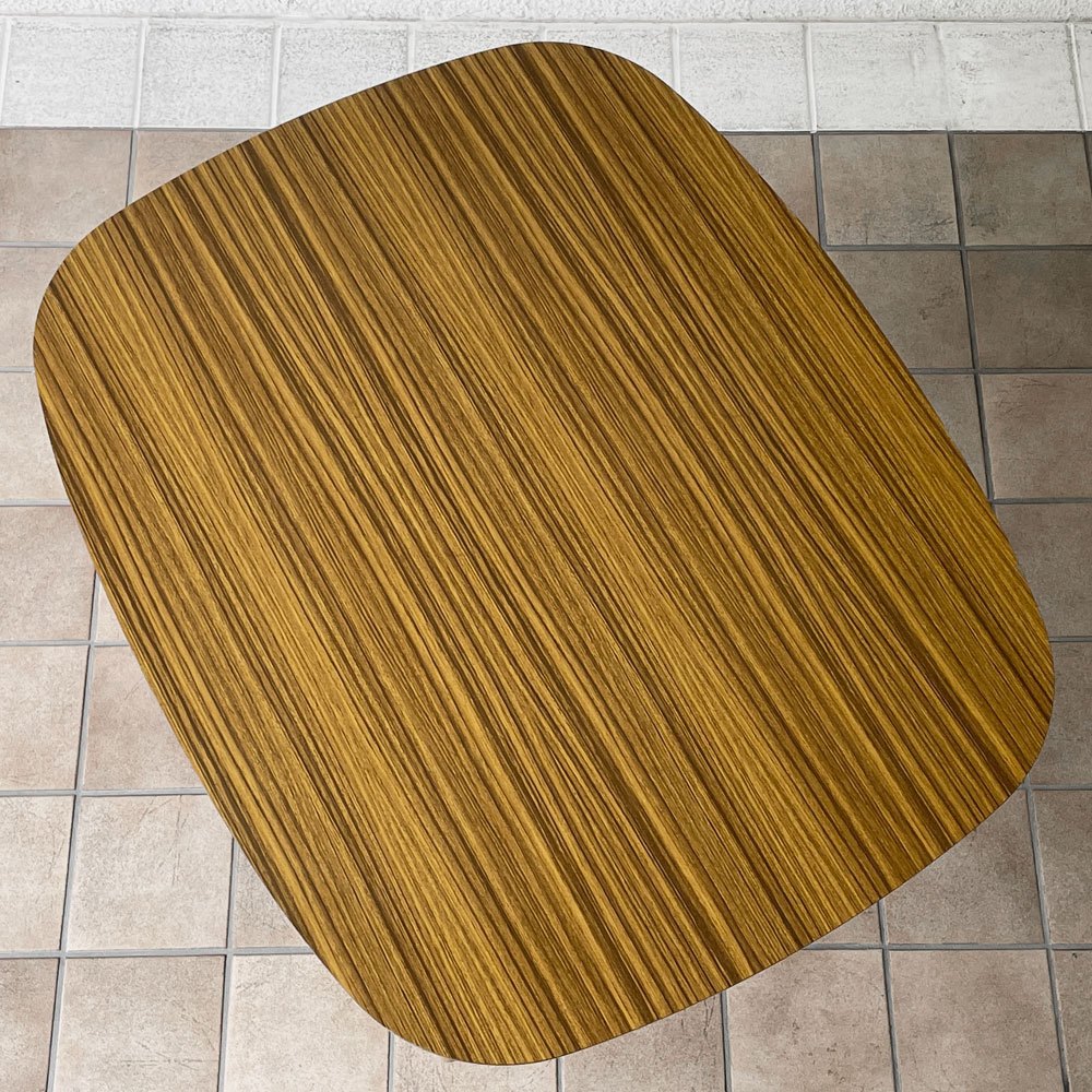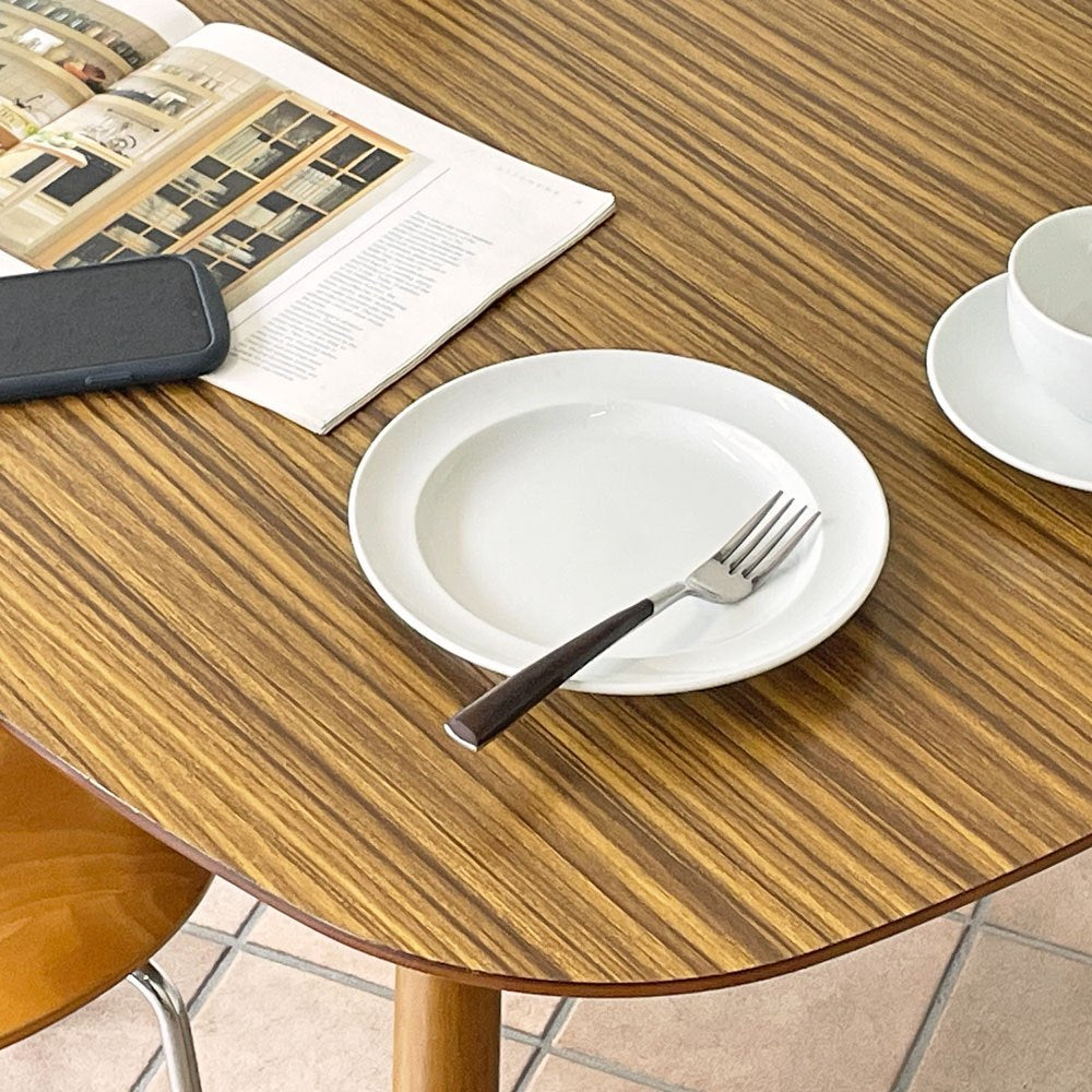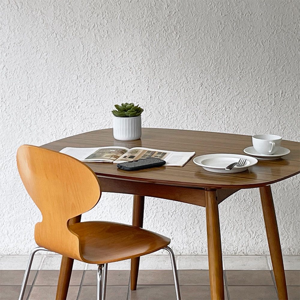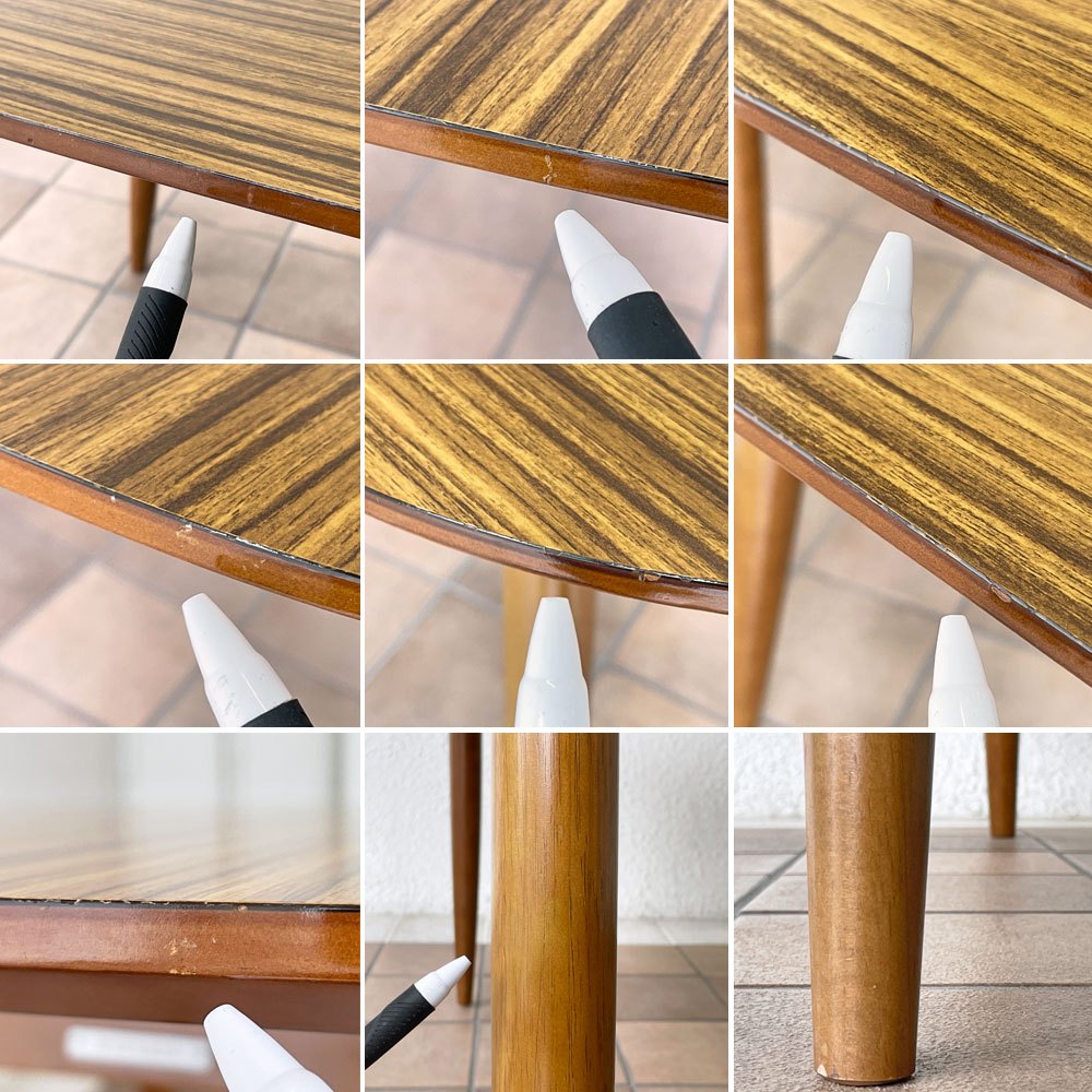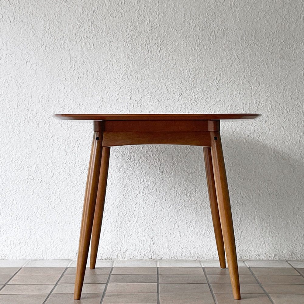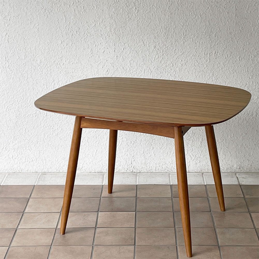 角の無い天板とジャパニーズミッドセンチュリー家具を思わせるメラミントップがレトロなダイニングテーブルです。