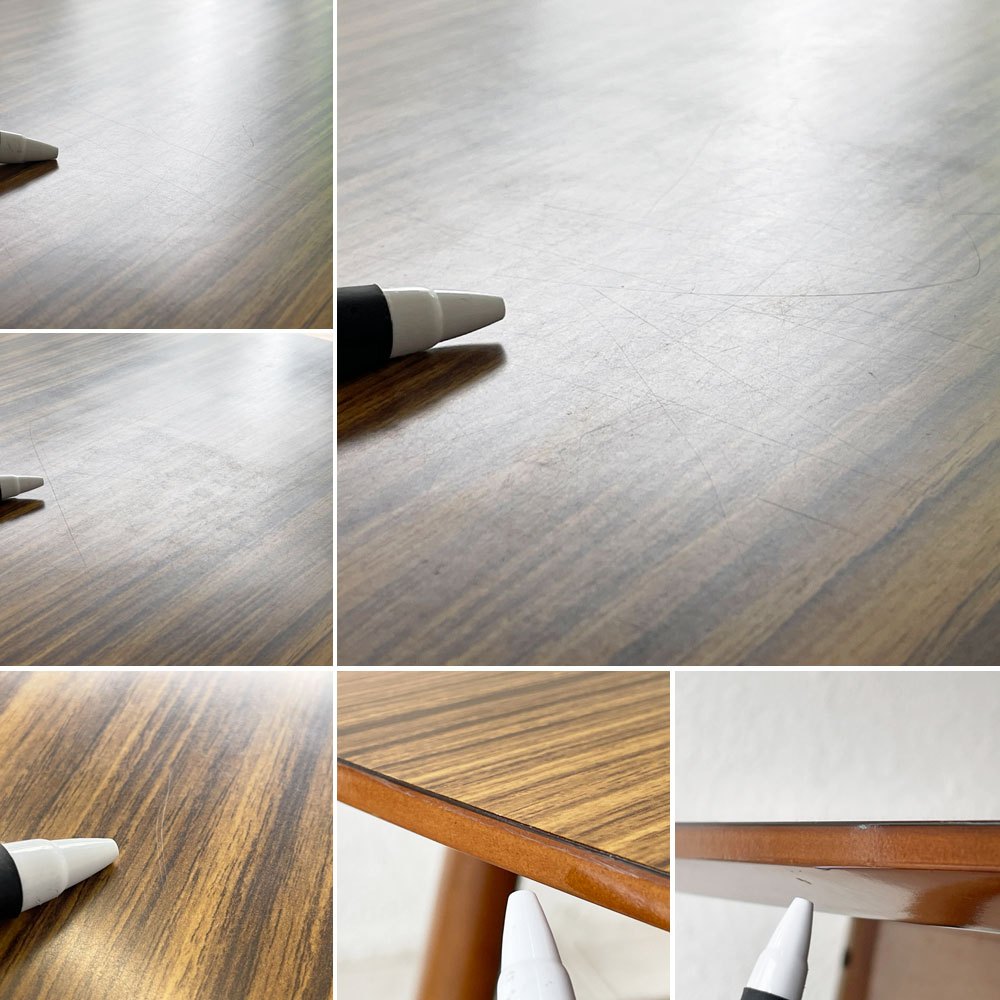 使用に伴う擦れ傷の他、天板には細かなスクラッチや線傷、縁の打痕やペイントロス、脚部を中心にうっすらとしたヤケ等はございますがいずれも大きく目立つものではございません。ほか天板と脚部の接続部には微細な反りによる隙間がございますが、通常のご使用に影響する程度ではございません。グラつき等ご使用に問題となるダメージは無く、今後とも雰囲気を楽しみながらお使い頂けるUSED品として概ね良好なコンディションを保っております。