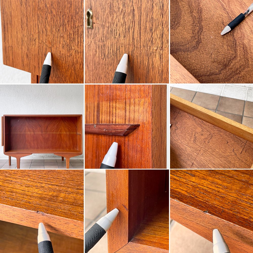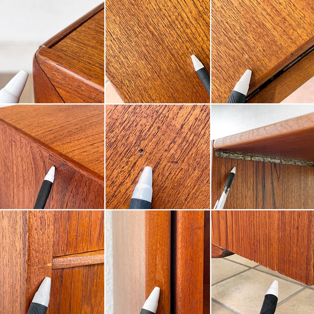 こちらはビンテージ品となります。使用に伴う擦れ傷の他、細かな打痕やスクラッチ、うっすらとした線傷、棚板ヤケ、突板の細かな剥がれ、天板縁補強材の隙間等はございますが、いずれも大きく目立つものではございません。ほか最上段左側のドロワーにはうっすらとしたヤケのほか化粧材のひび割れや剥がれ、右側1杯のドロワーには開閉時にごく微細な固さ、背面側オープンシェルフの棚板受けにはヒビなどがございますが実用に影響するものではございません。ご使用に問題となるダメージは無く、引き続き雰囲気を楽しみながらお使い頂けるビンテージ品として概ね良好なコンディションを保っております。