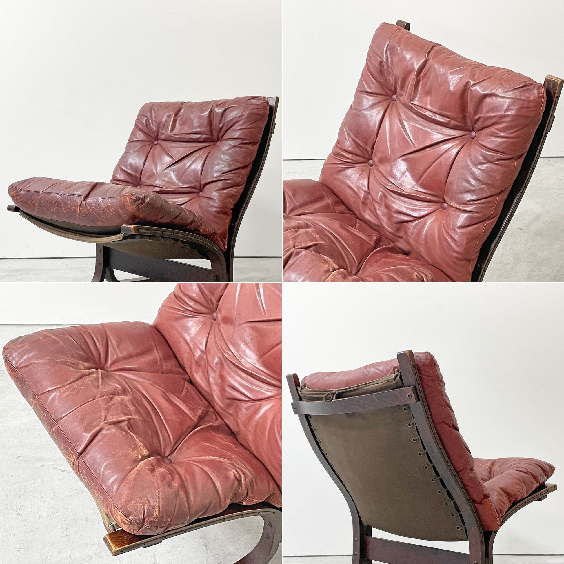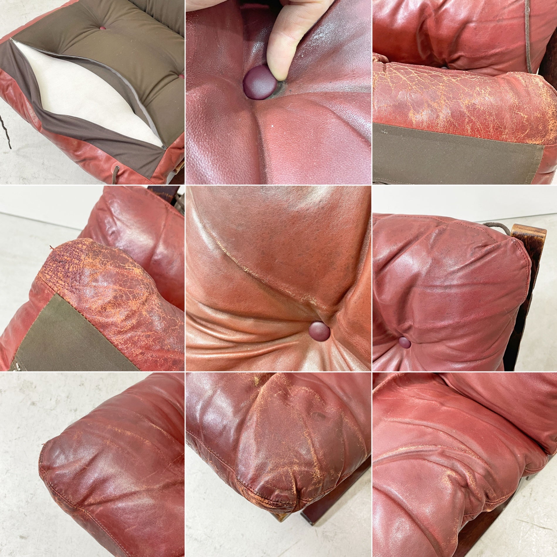 こちらはビンテージ品となります。経年に伴う擦れや傷、レザー表面のヒビ割れや染み、色褪せや日焼け、座面下のファブリックシートの染み、フレームの傷や擦れ等がございます。その他、ガタつきやグラつきの使用に問題となるダメージはございません。ウレタンクッションは弊社にて交換済みのため、これからも気持ち良くご使用いただけるコンディションを保っております。