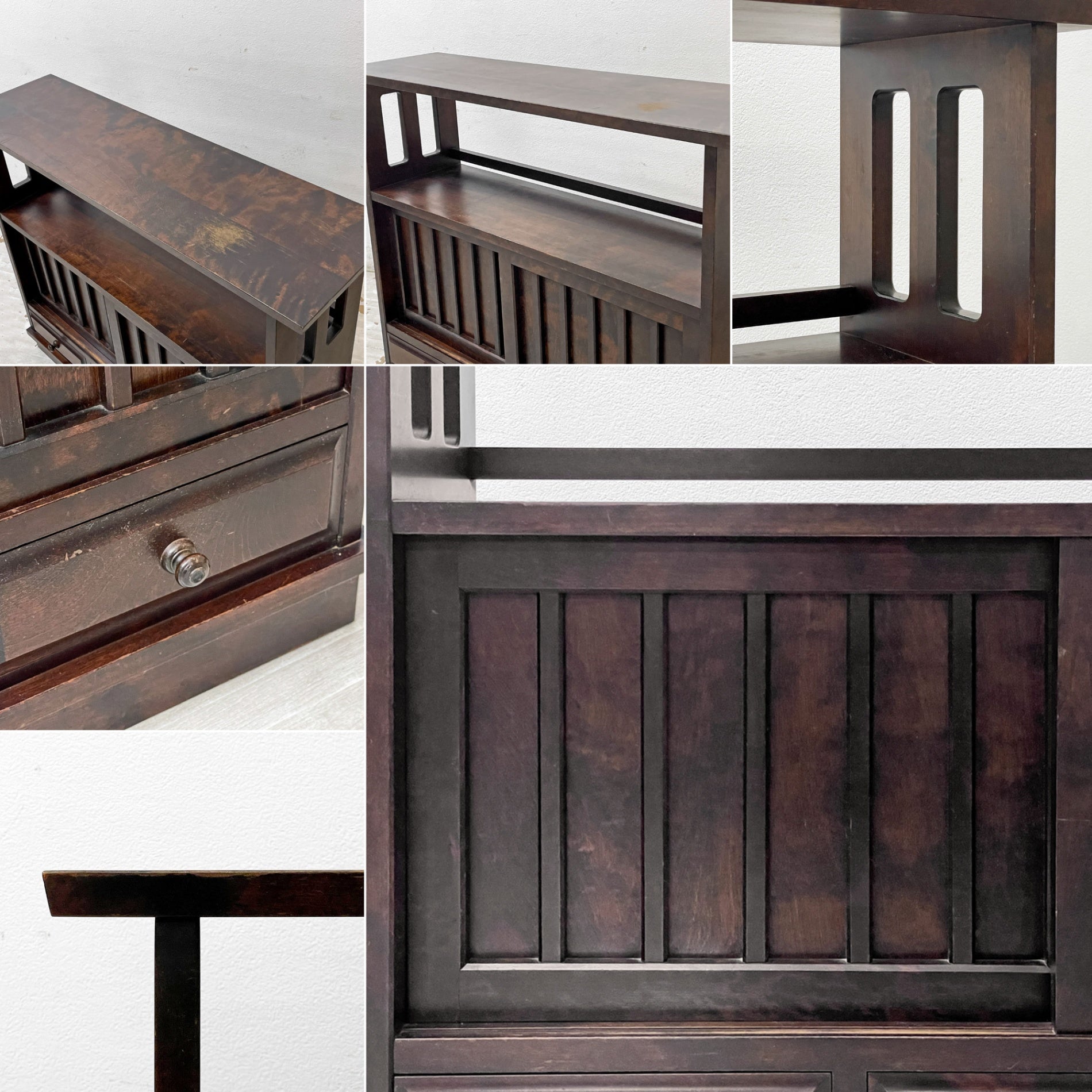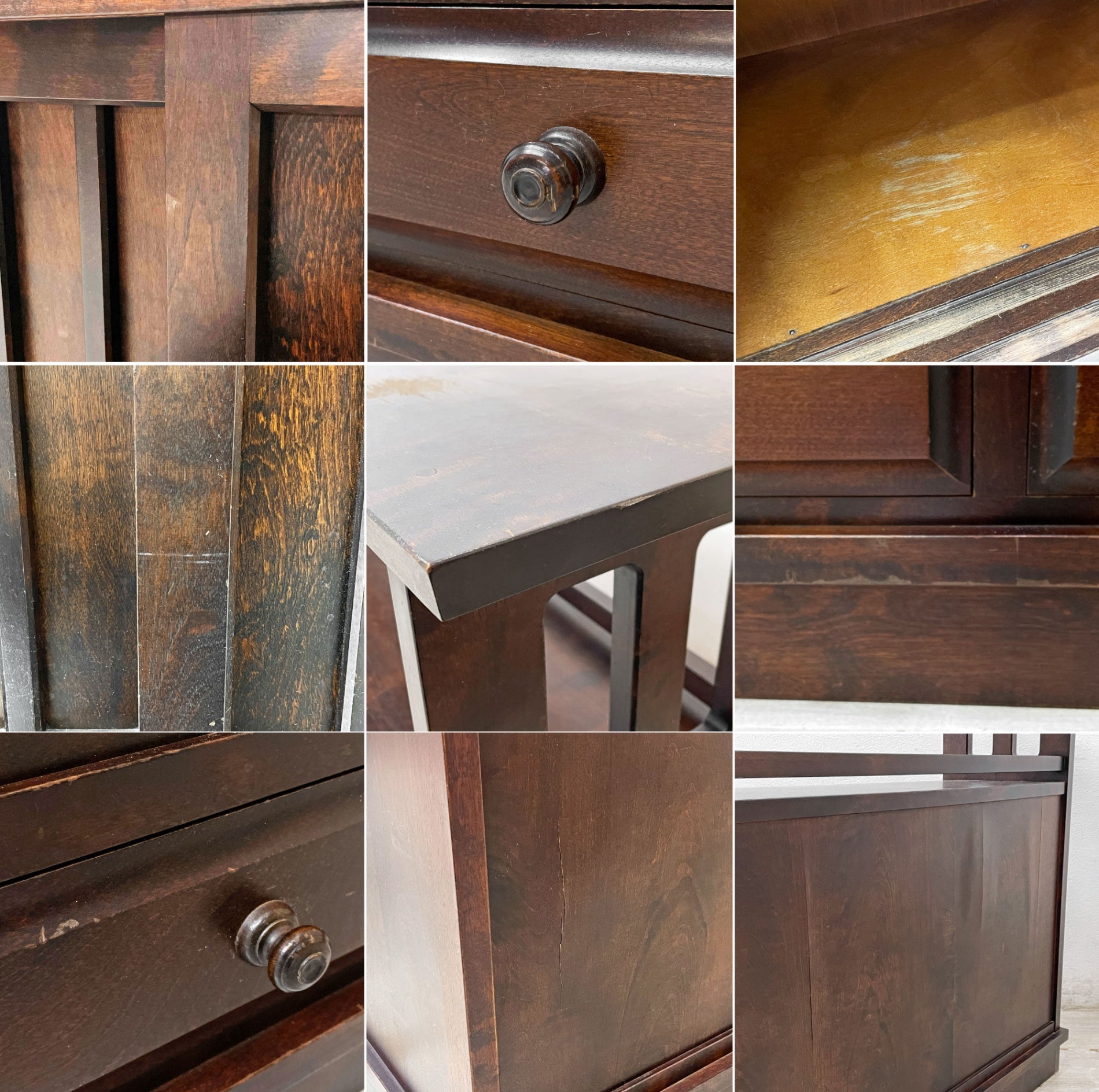また、天板と抽斗内部にそれぞれ一箇所ずつ、大きなペイントロスが見受けられ、裏面には突板の浮きと微細なクラックが見受けられますが、いずれも実用に大きな影響はございません。