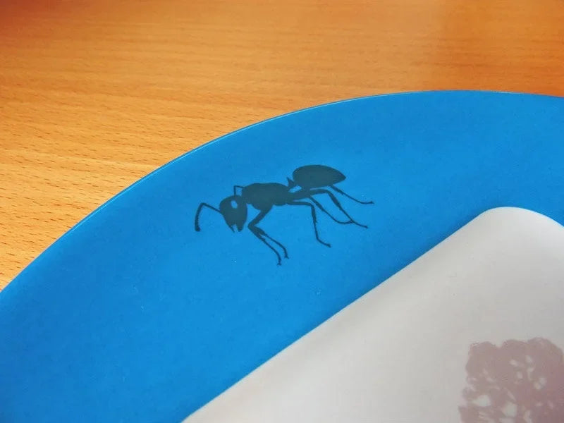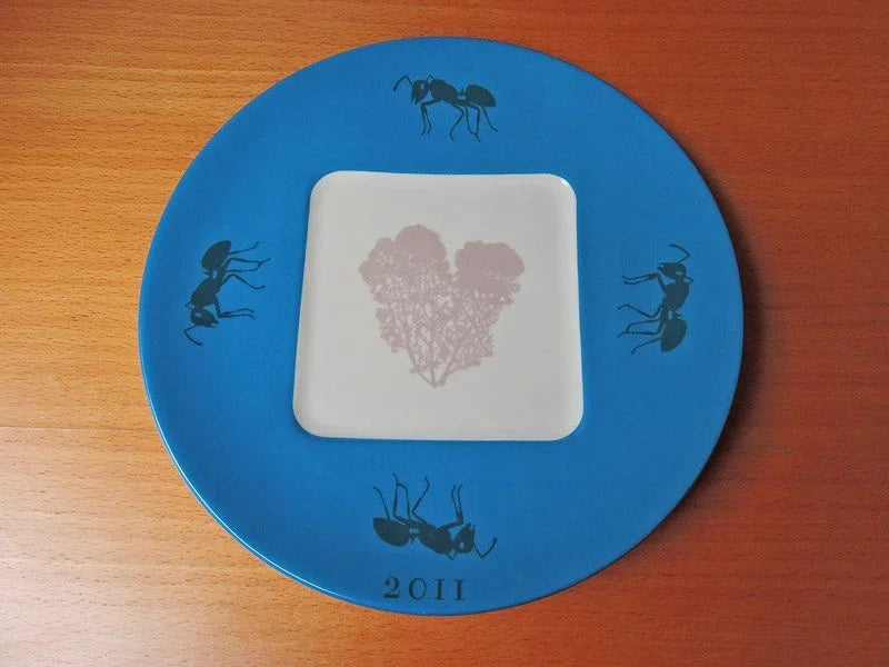 植物と蟻をモチーフにした絵柄に、丸皿の中に四角い形を組み合わせたユニークな作品です。鮮やかなブルー色が目を惹き、インテリアとして飾るのも◎!