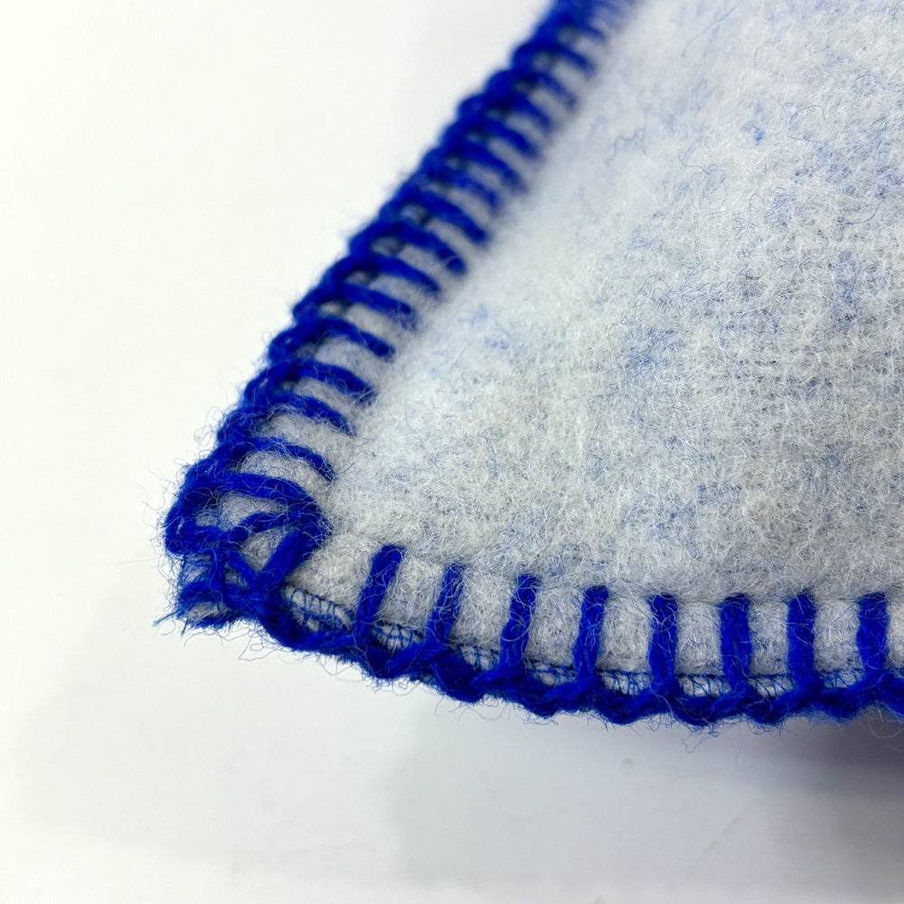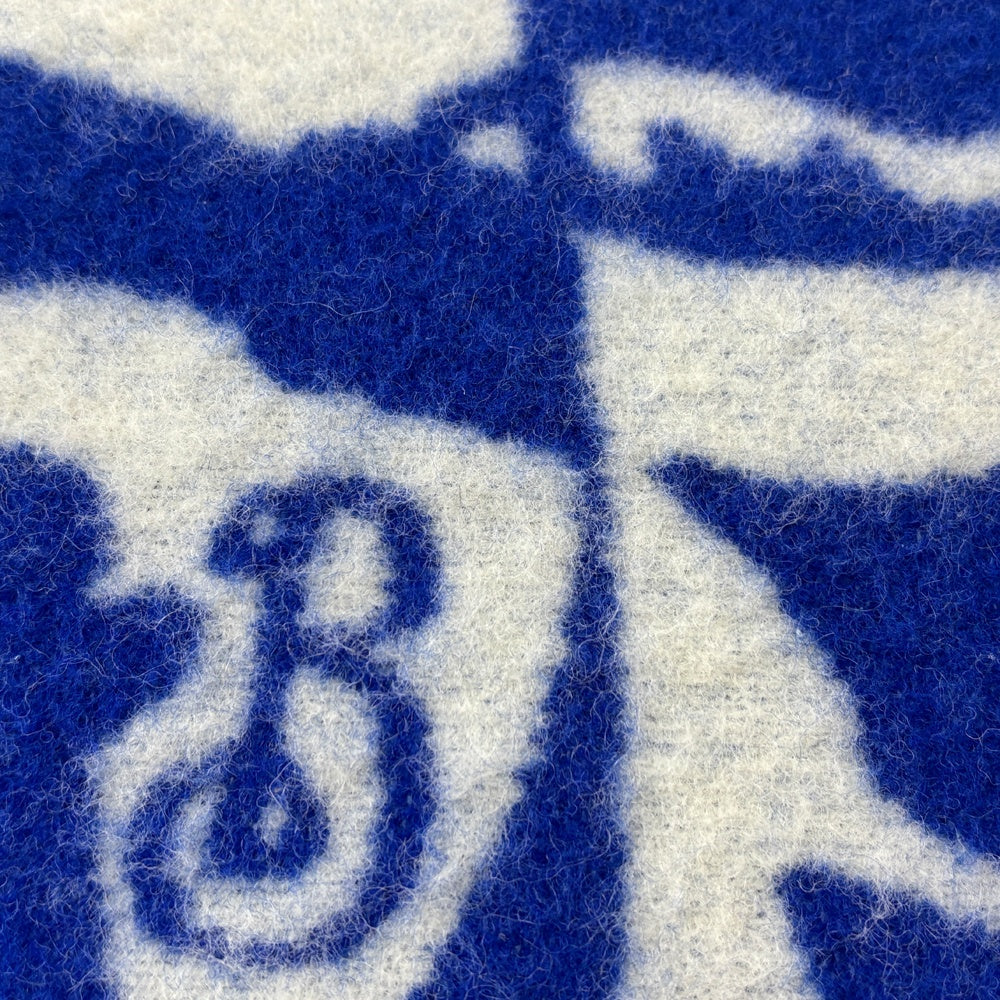 風を切りながら走る躍動感のある騎士と軍馬のシルエットが大胆に表現され、鮮やかなブルー色とのツートンカラーを背景と反転させたデザイン。エッジはブランケットステッチにより丁寧に仕上げられ、ウールの柔らかい手触りも心地よく感じられます。