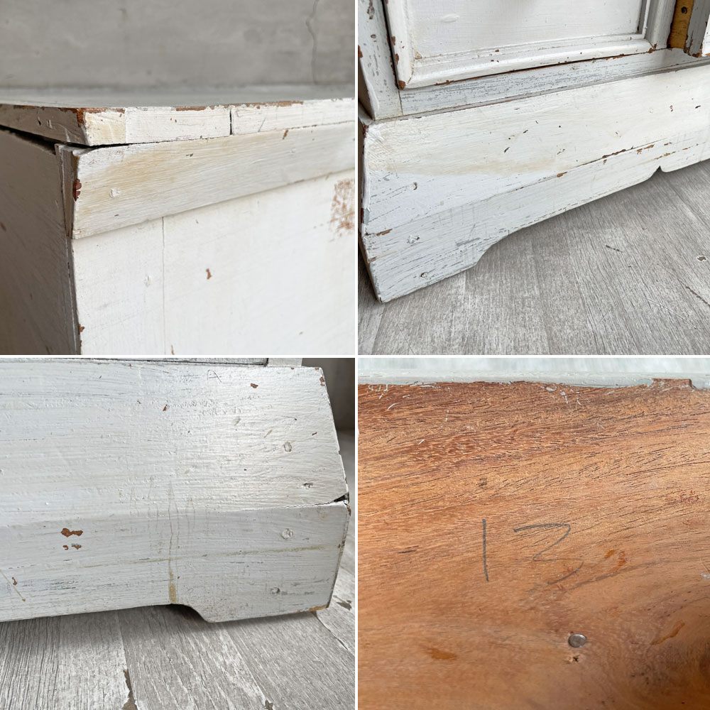 使用に伴い、擦れやペイントの剥がれ、線傷や落としきれない黒ずみ、側板や背板には割れや隙間が見受けられます。